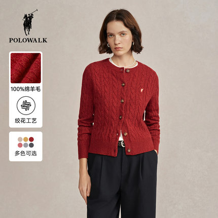 【100%绵羊毛】POLOWALK女士针织开衫女秋冬款绞花百搭针织衫毛衣