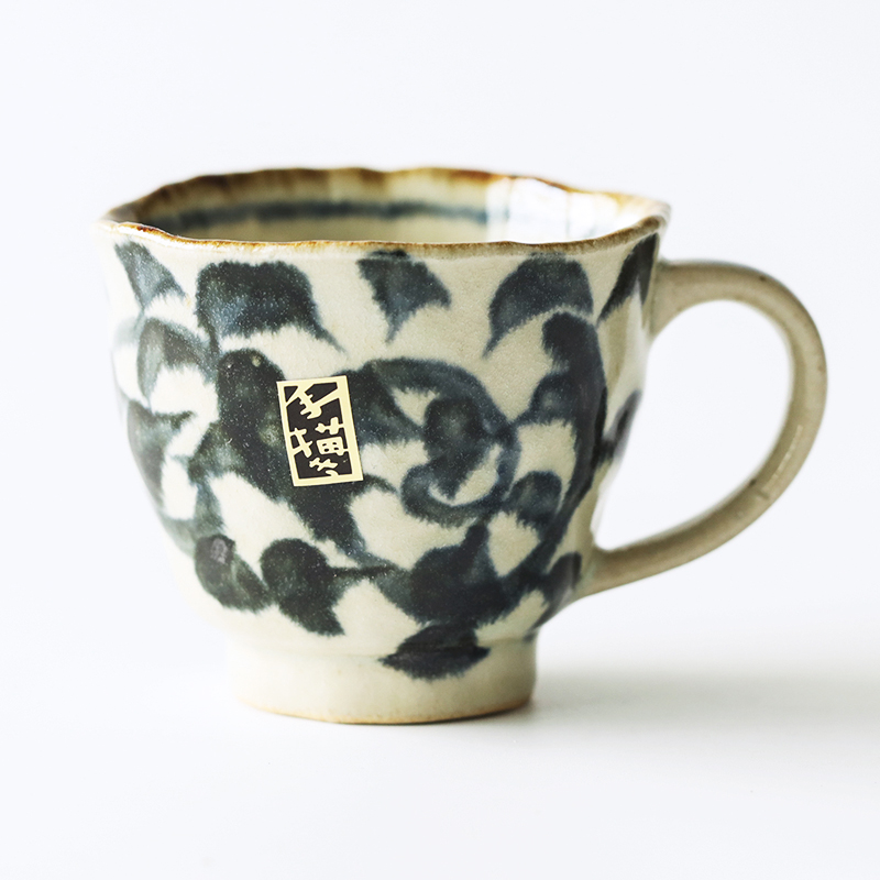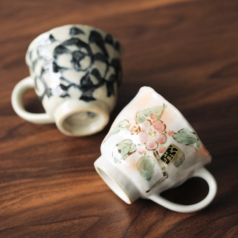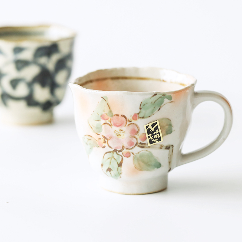 日本制美浓烧手绘复古唐草茶杯樱花马克杯釉下彩陶瓷咖啡杯水杯子