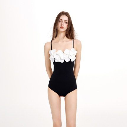 少年齐 原创高级感简约立体花朵黑白小众度假温泉连体女士游泳衣
