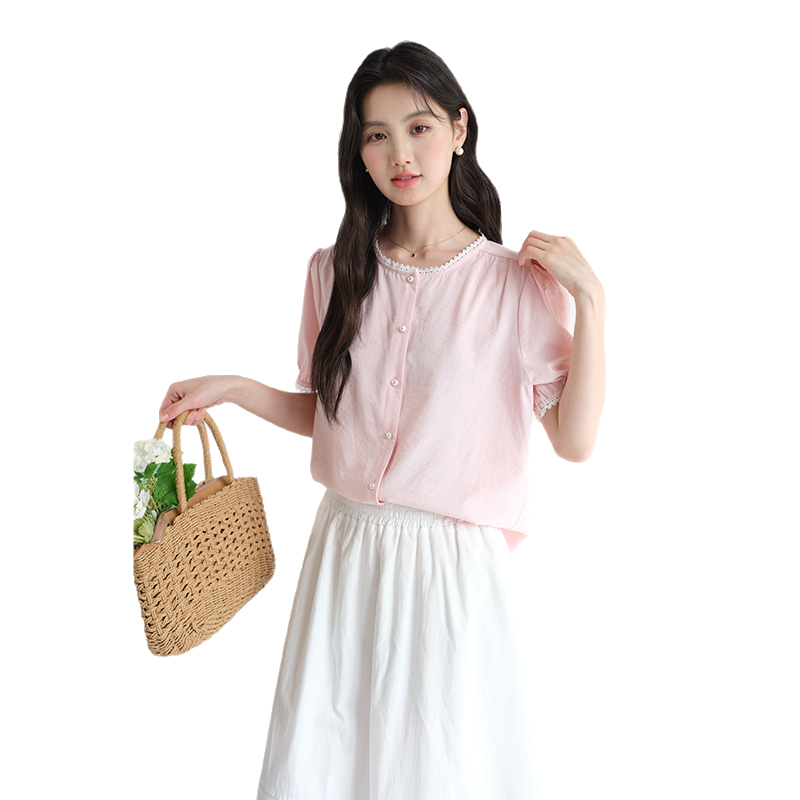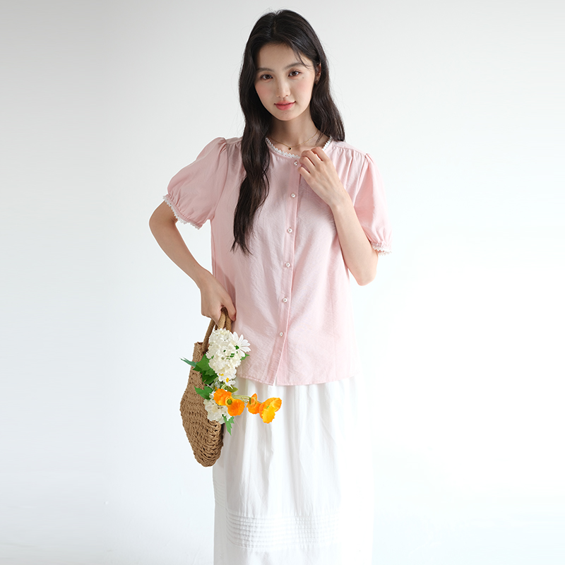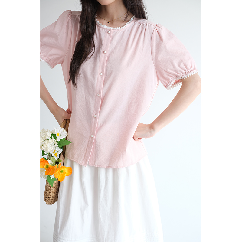 蓝若水大码女装甜美气质花边圆领衬衫2025夏装新款法式短袖上衣