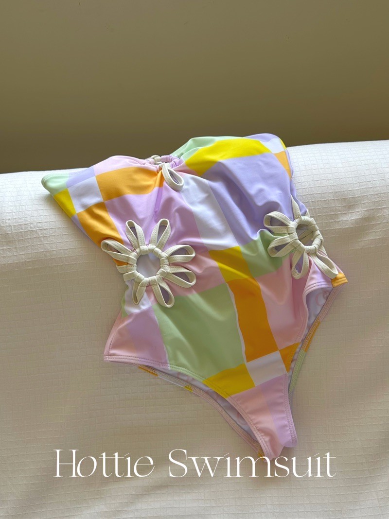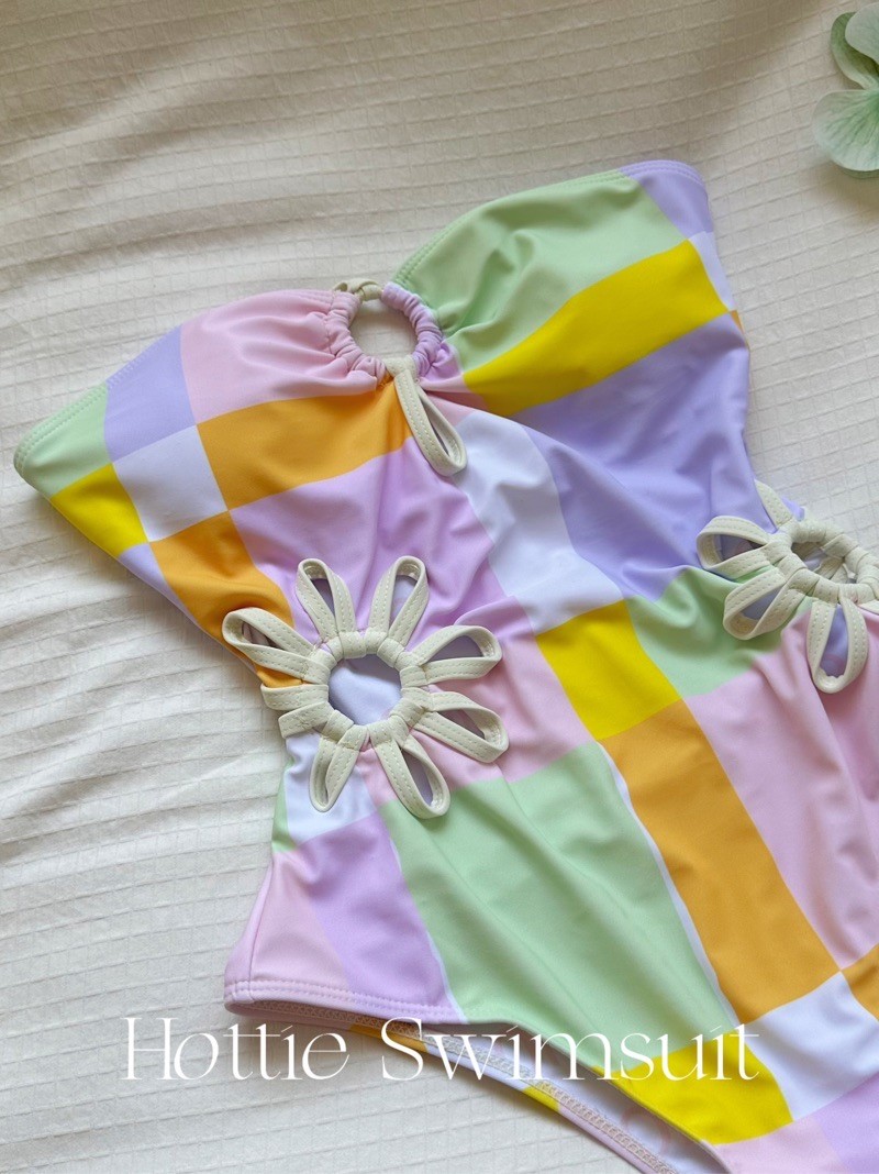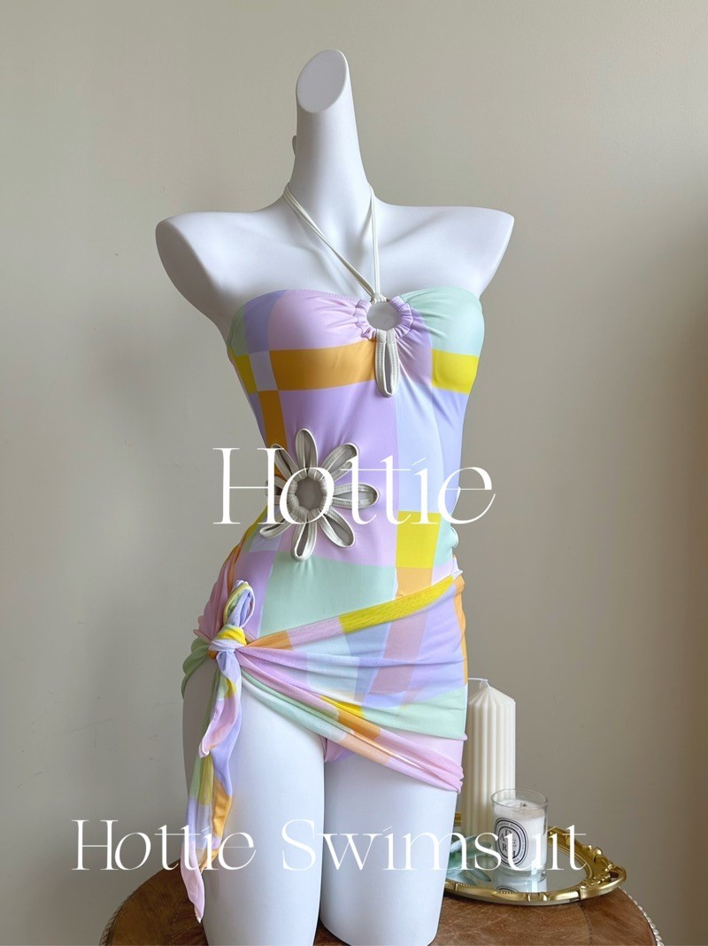 夏日多巴胺少女镂空花朵挂脖连体泳衣可外穿沙滩温泉度假彩色泳衣