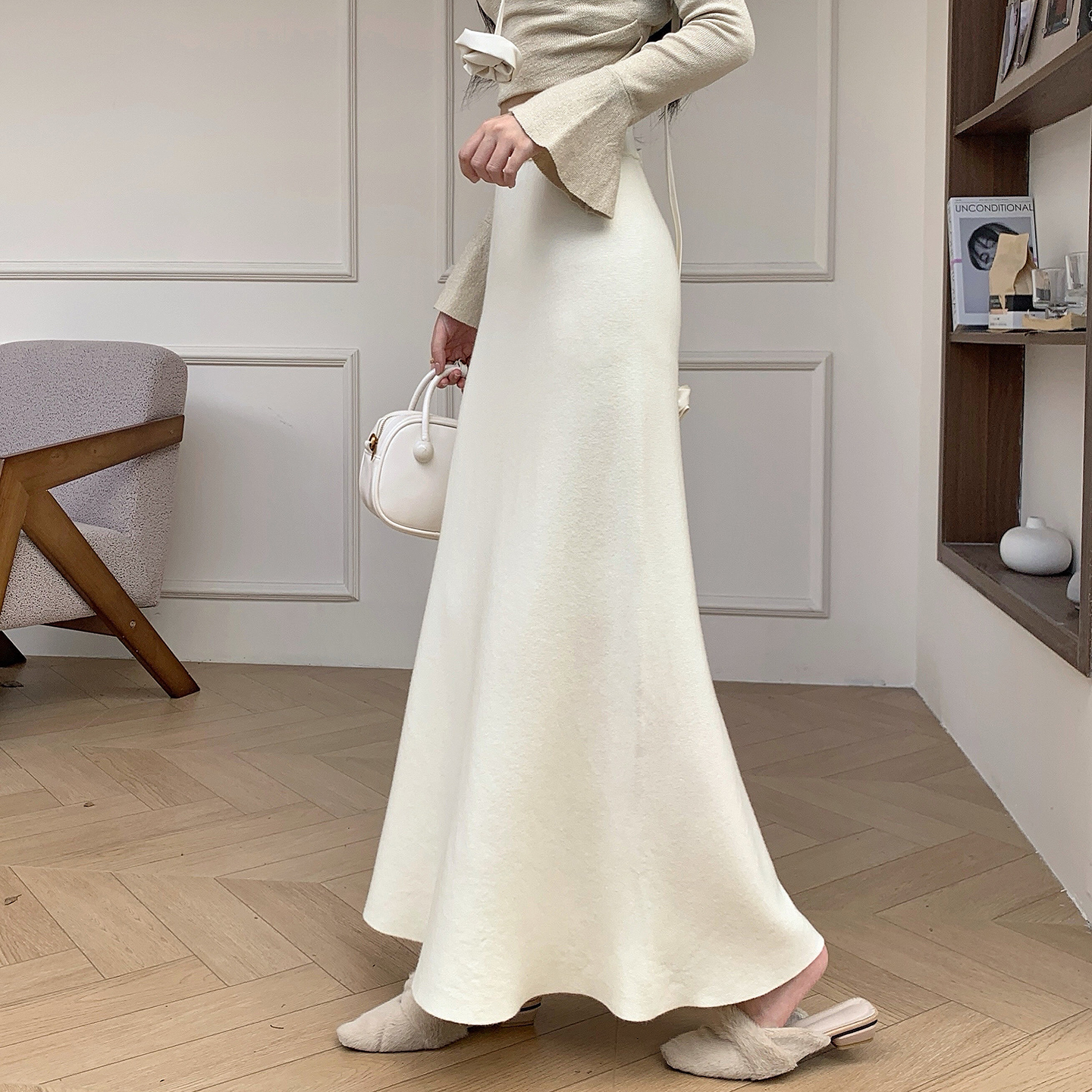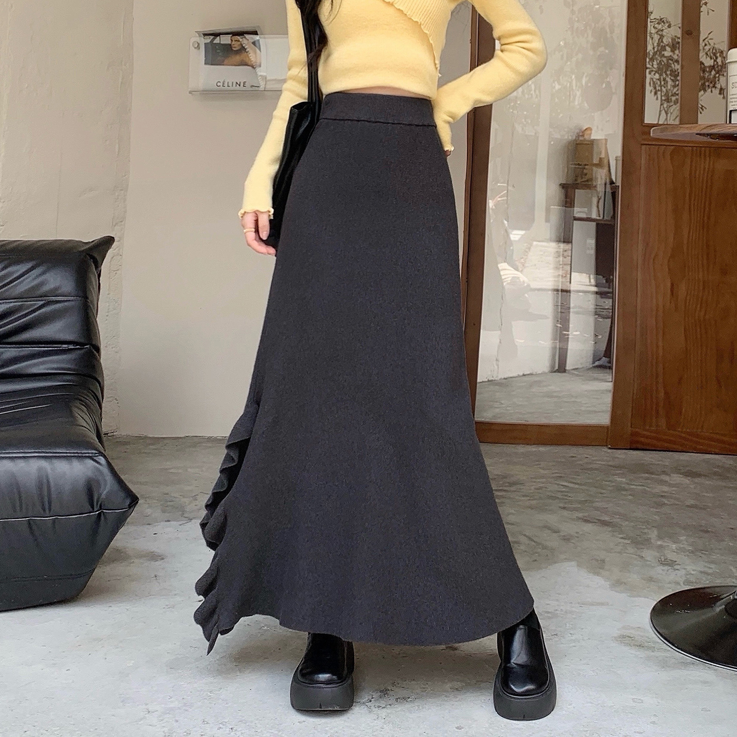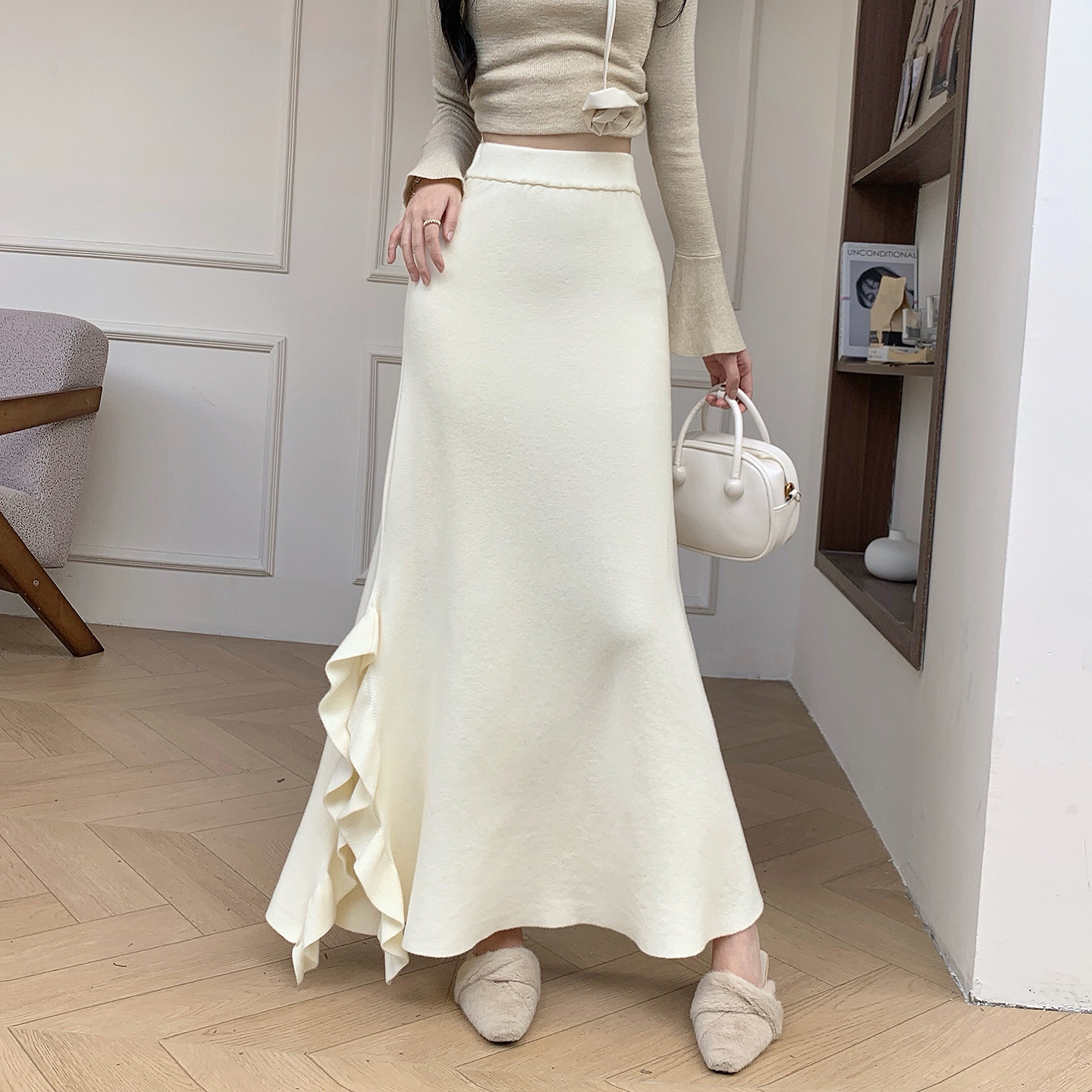 荷叶边侧开叉针织半身裙女2025秋冬高腰显瘦a字长裙子包臀鱼尾裙