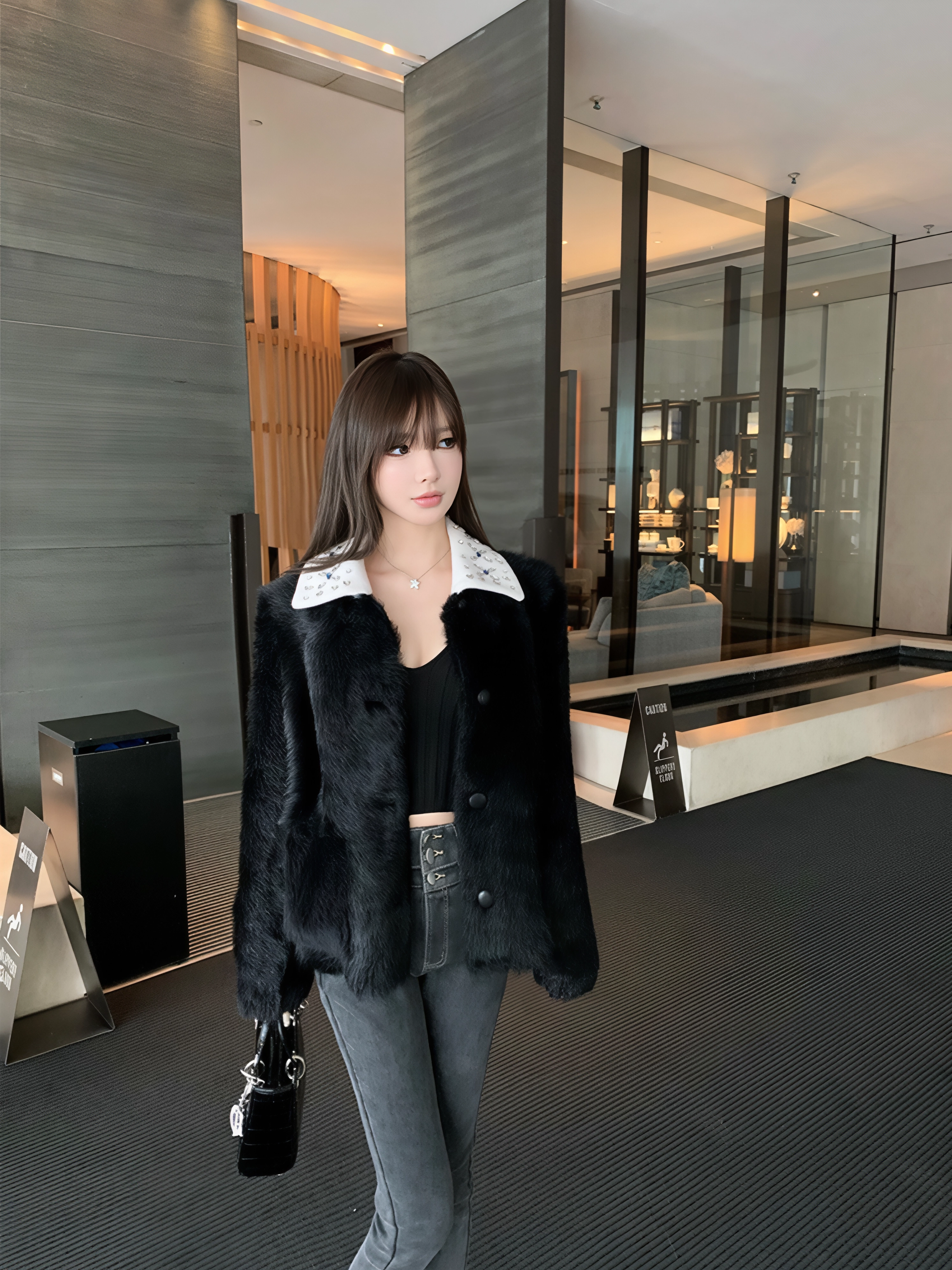 黛茗颜重工钉珠亮片小香风女轻奢千金黑色名媛钻石领托卡皮草外套