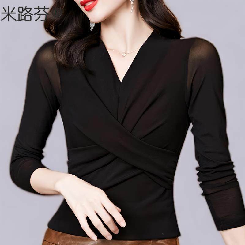 广场舞女V领春秋大码显瘦T恤修身气质拉丁舞交谊舞上衣长袖打底