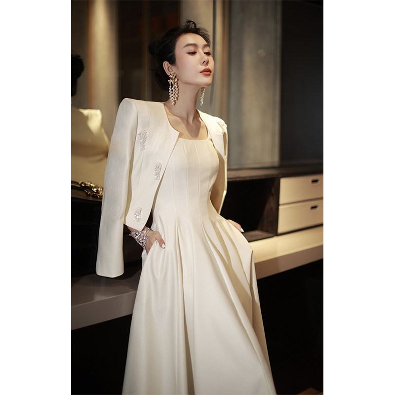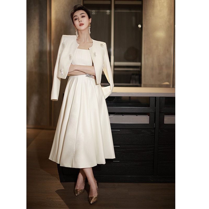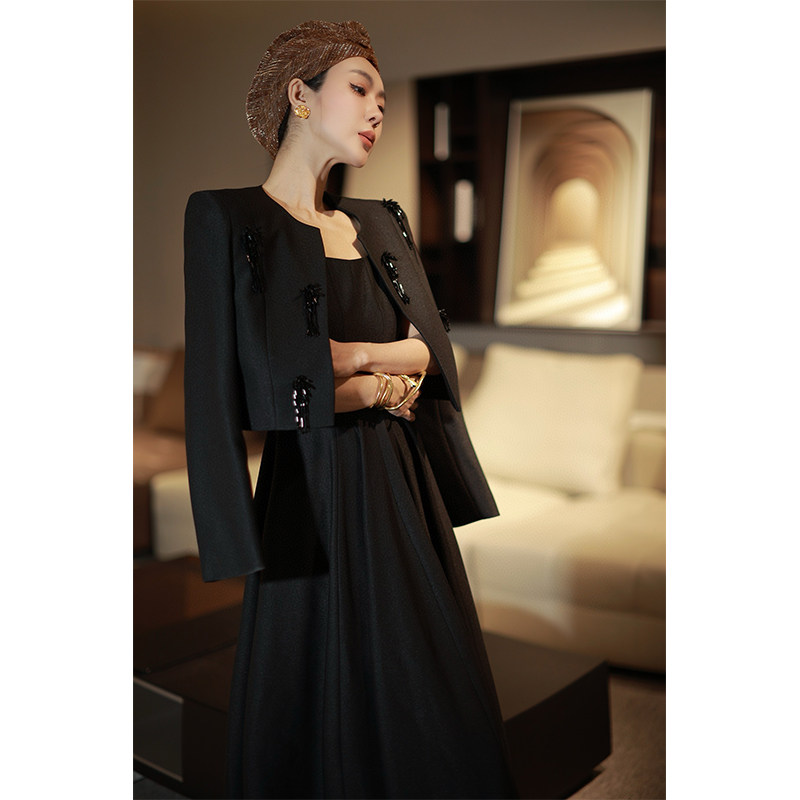 欧洲站法式女装订珠短外套收腰大摆背心裙洋气两件套气质时尚套装