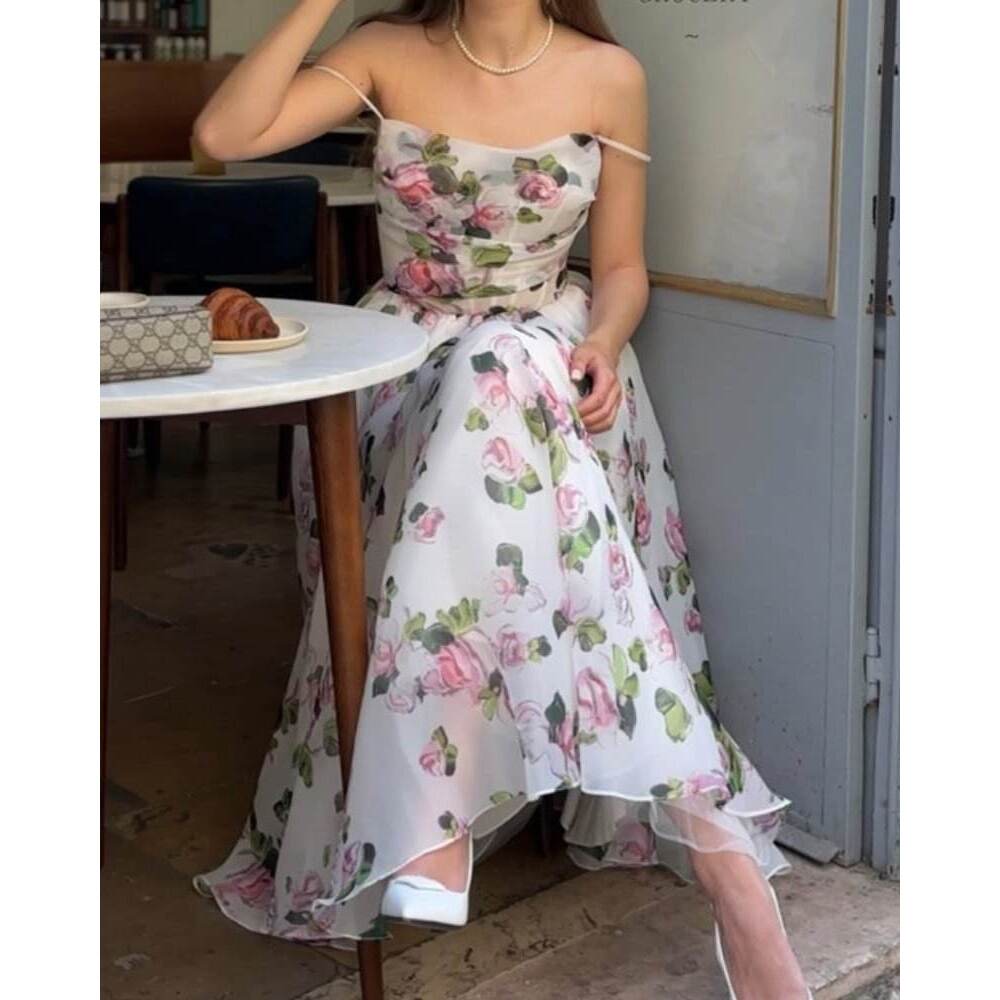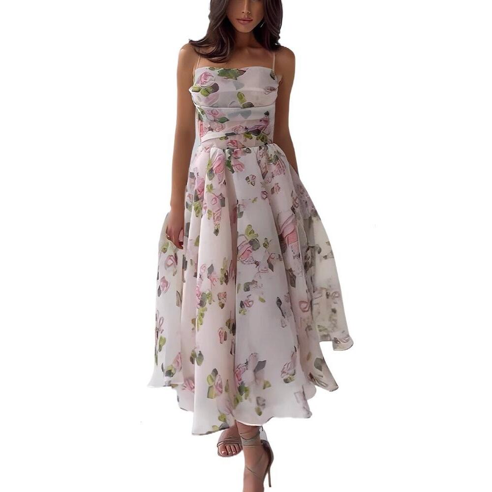 2023外贸欧美亚马逊夏时时尚玫瑰印花中长居家吊带连衣裙涤纶