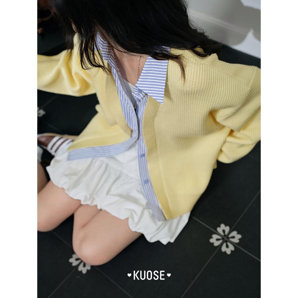 阔色浅黄色假两件条纹开衫毛衣外套女2025秋季新款学院风针织衫春