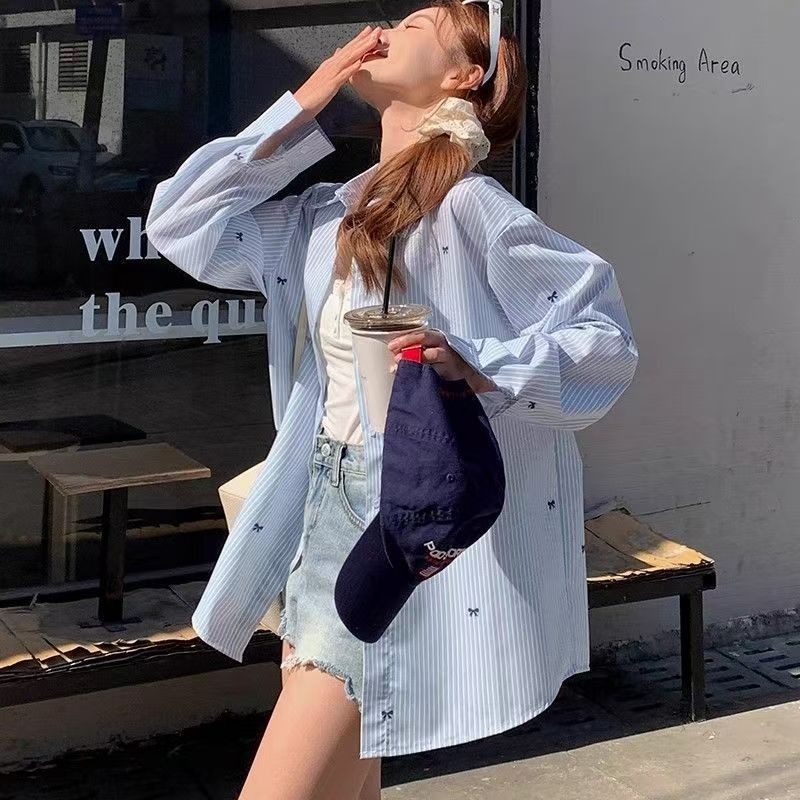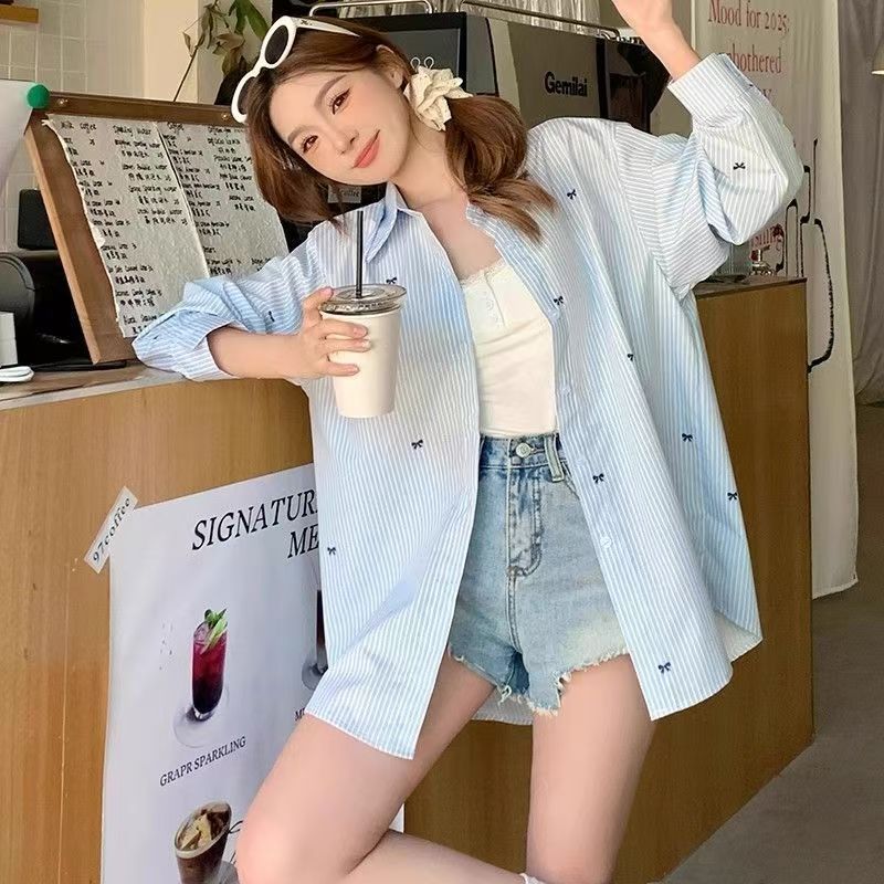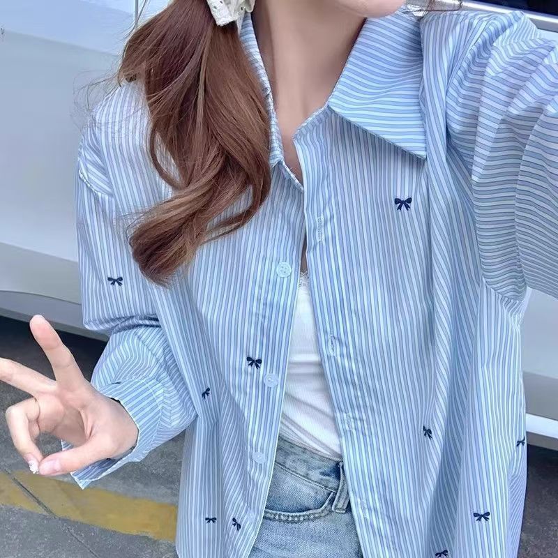 衬衫女防晒夏季蝴蝶结印花2025年新款宽松长袖浅蓝色条纹衬衣上衣