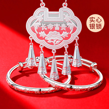 婴儿银手镯纯银9999银锁儿童银镯子平安锁满月礼物实心长命锁宝宝