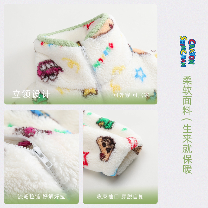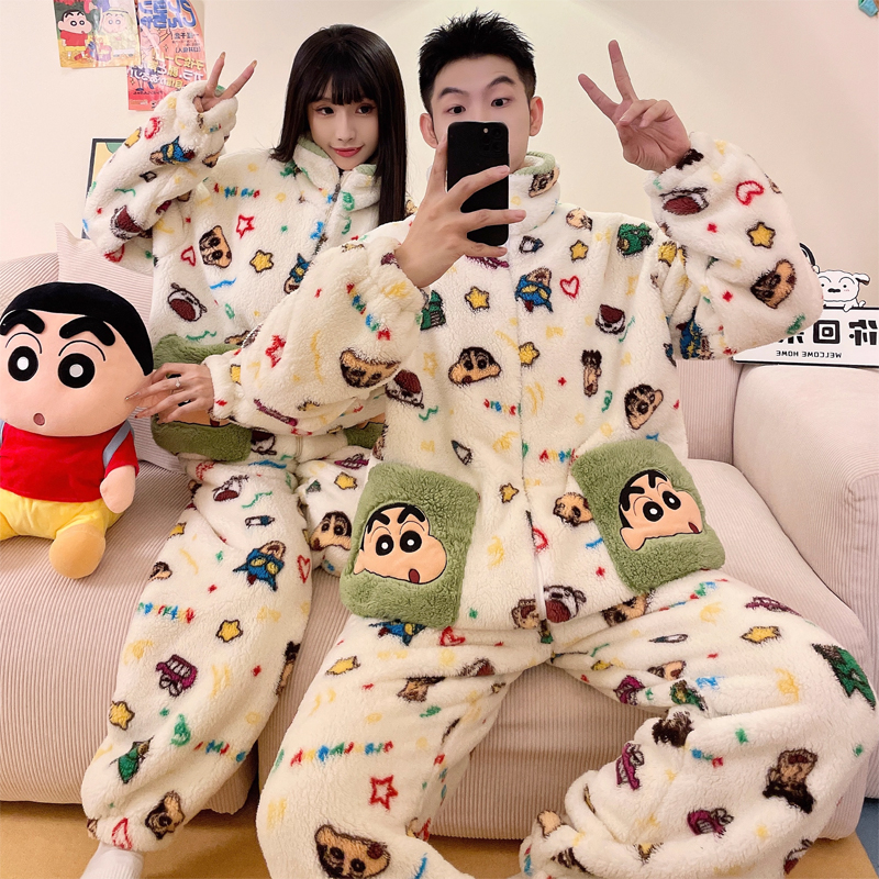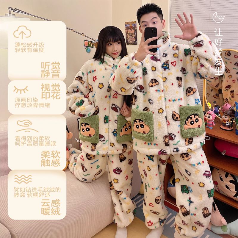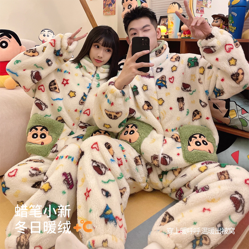 蓄蜡笔小新情侣睡衣秋冬男女款珊瑚绒加绒加厚家居服毛绒可爱居家