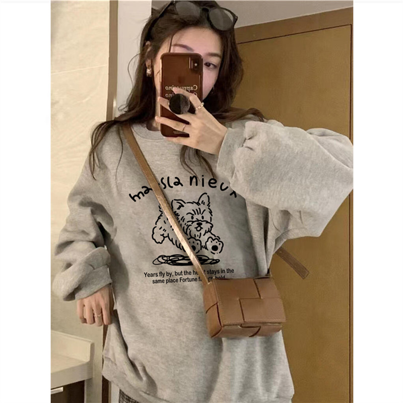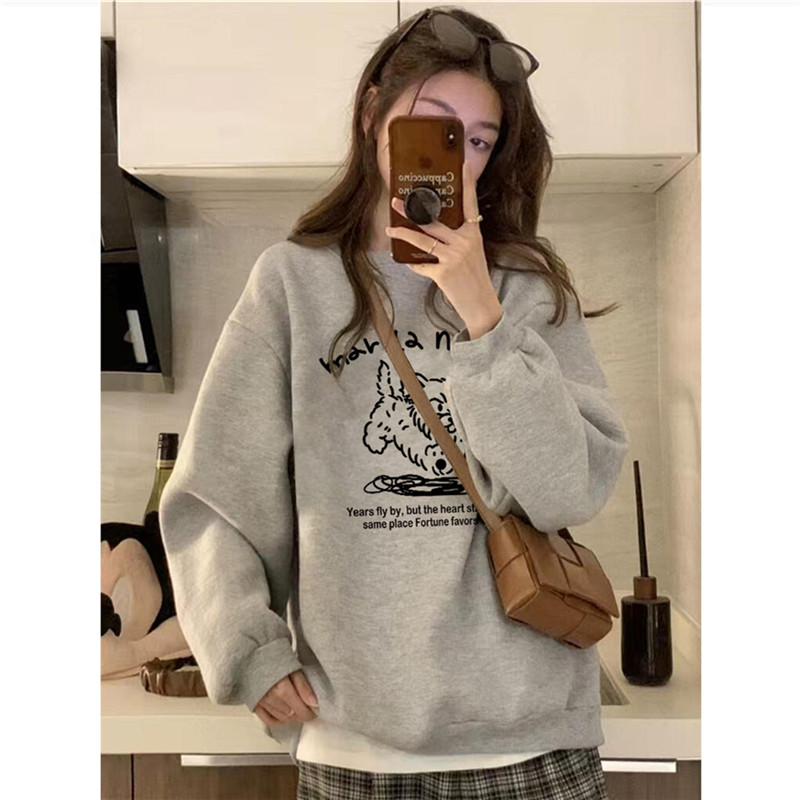 纯棉美式复古灰色套头圆领卫衣女秋冬加绒加厚宽松小众设计感上衣