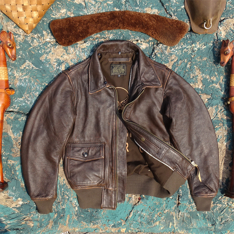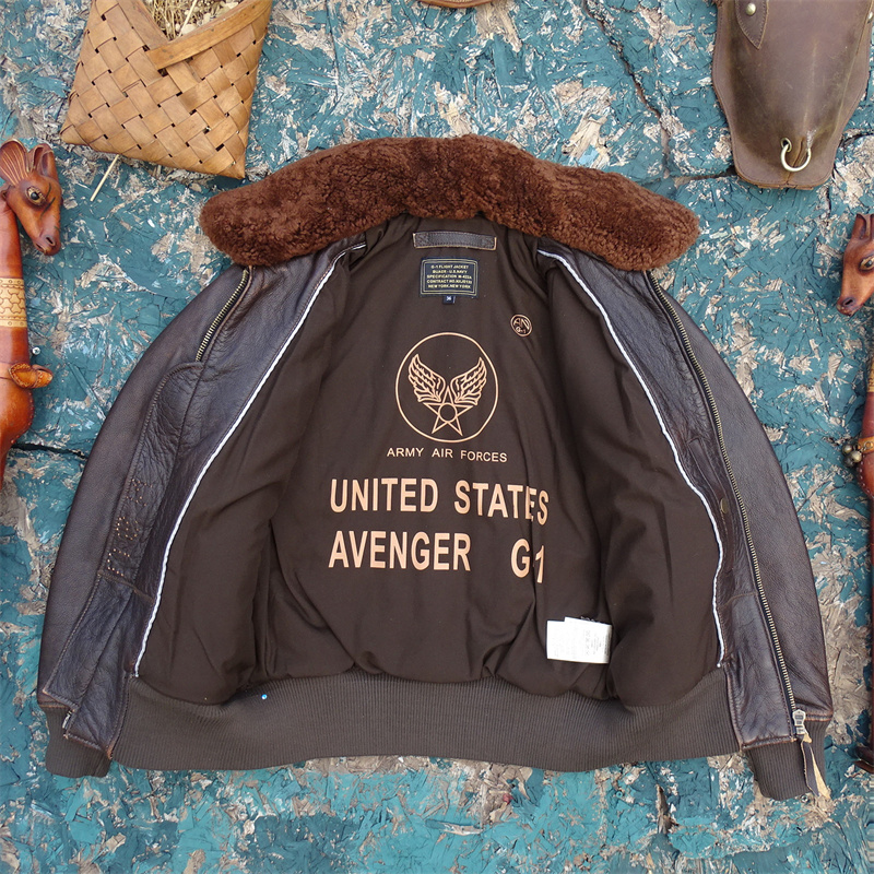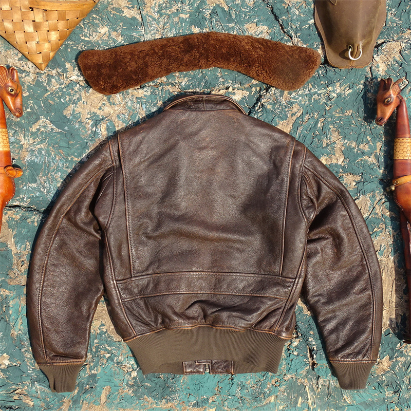 G1款可拆毛领飞行!棕色重水洗做旧牛皮真皮皮衣男款宽松版皮夹克