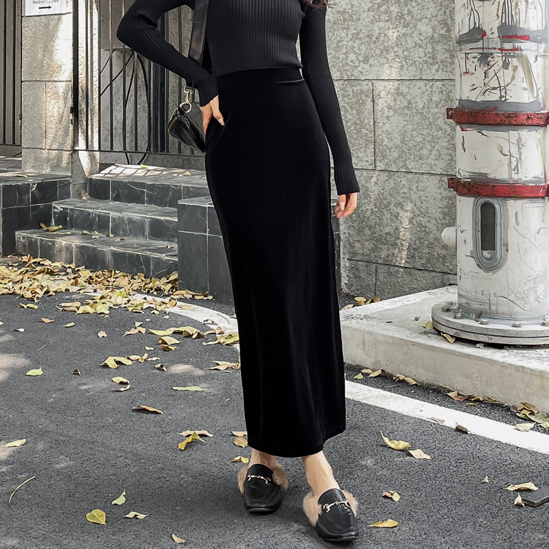 金丝绒半身裙女2025新款春秋高腰垂坠感复古开叉中长款显瘦一步裙