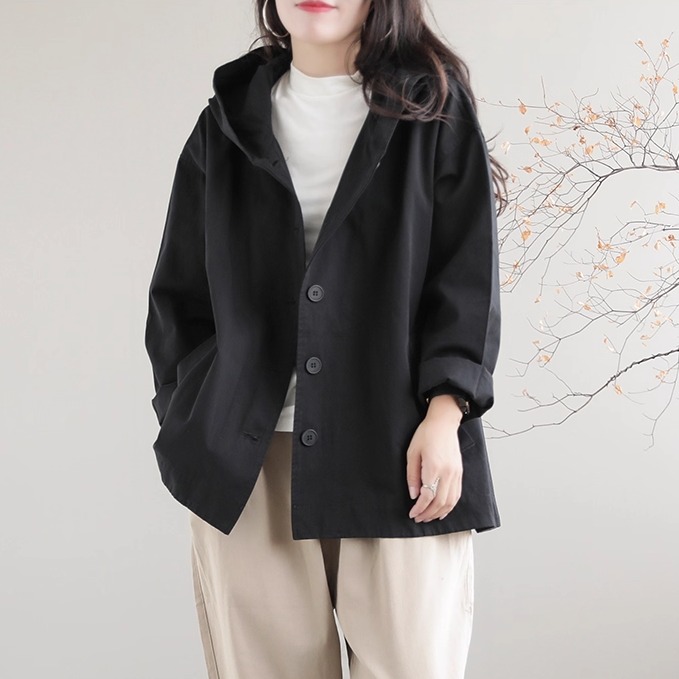 外贸出口原单女装复古全棉连帽外套秋季宽松百搭纯色风衣开衫上衣
