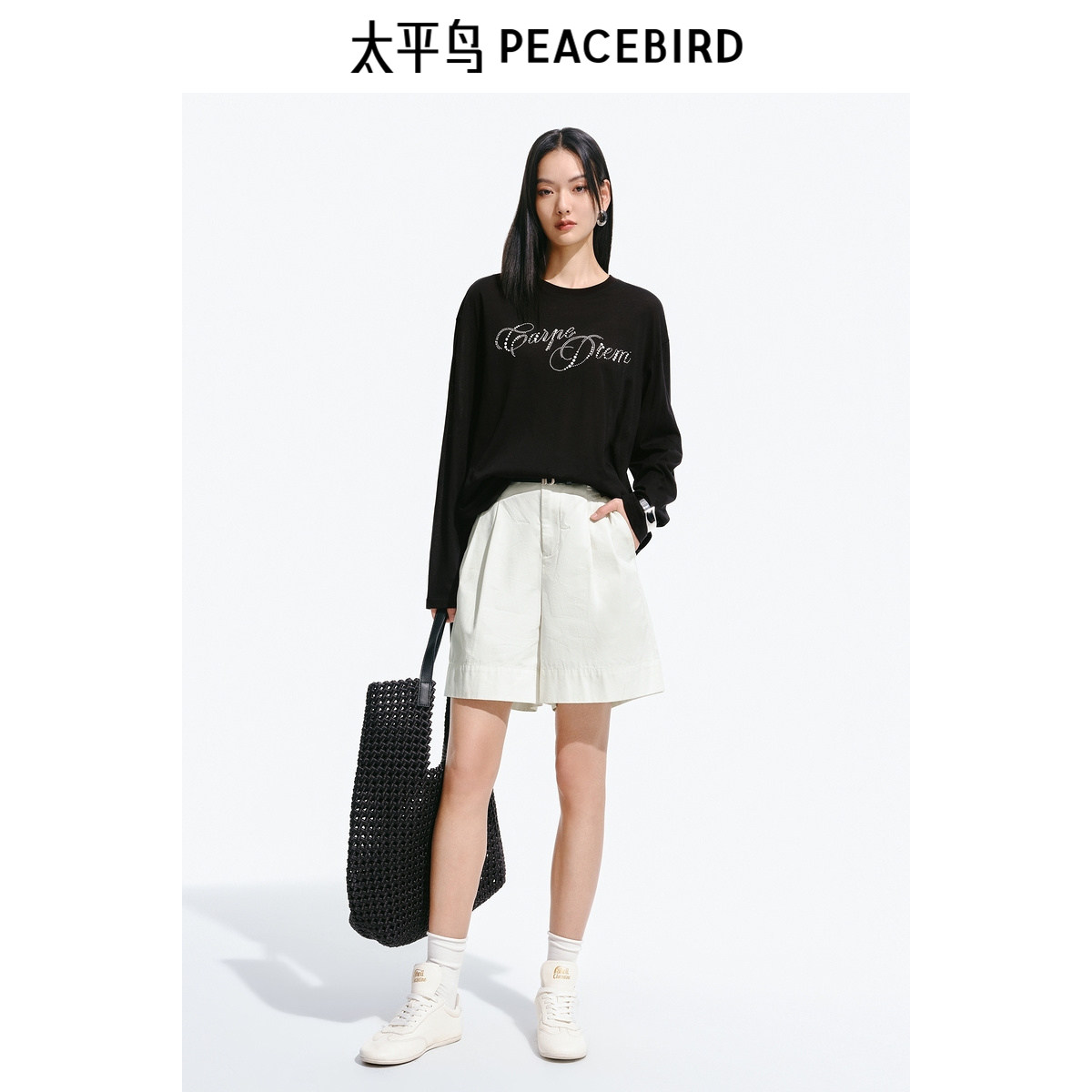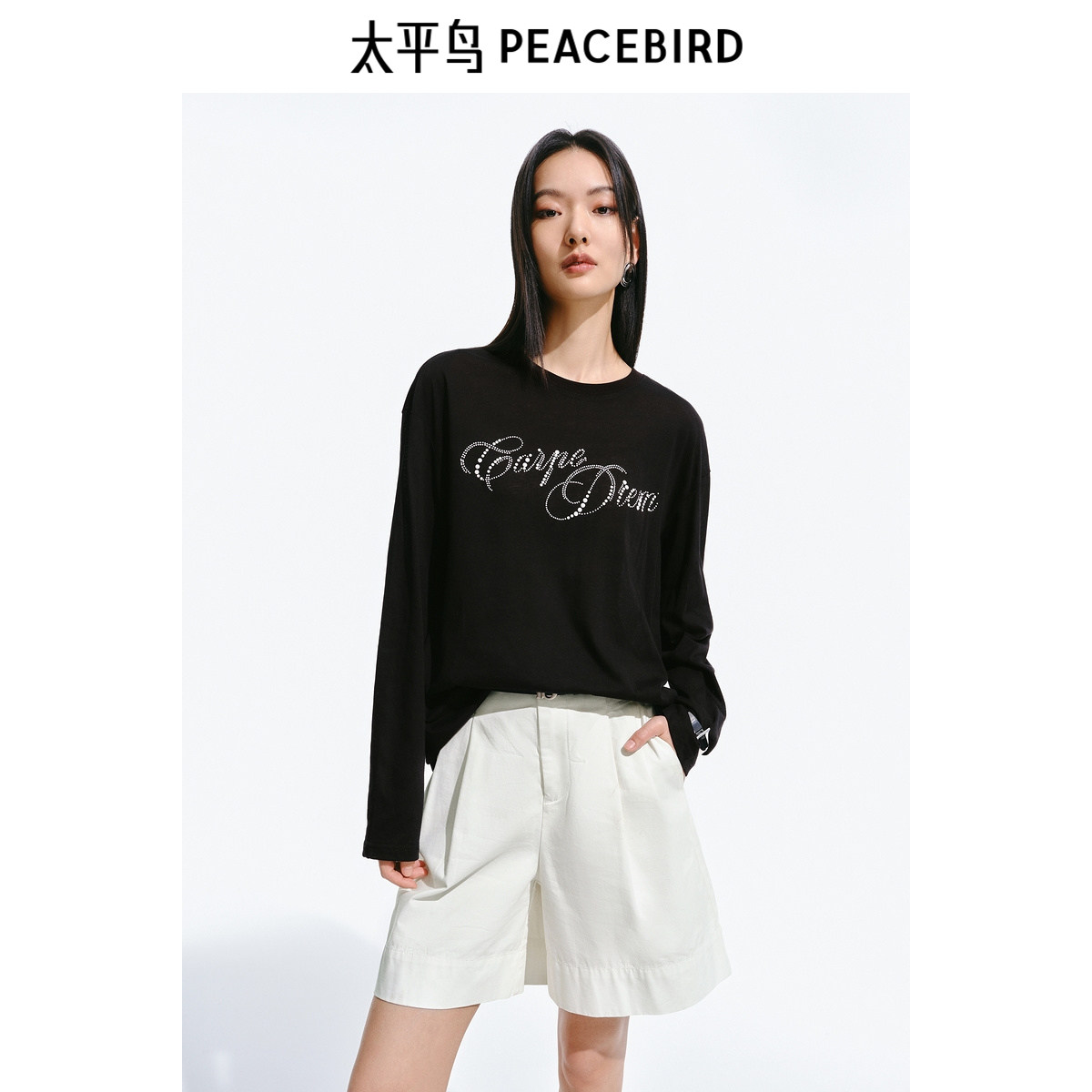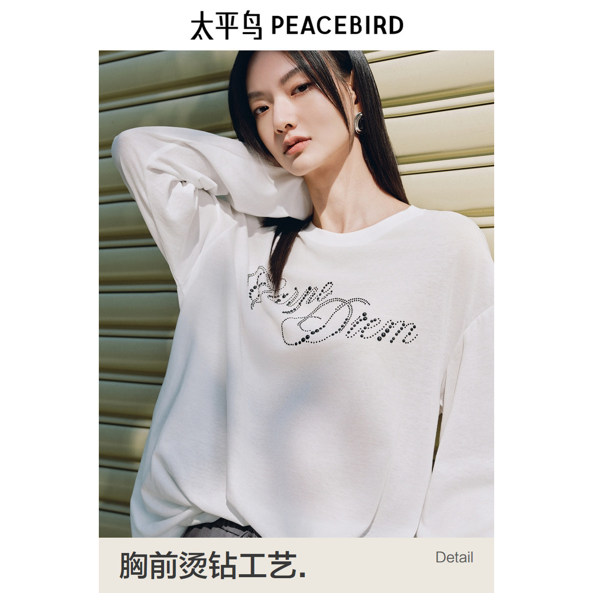 太平鸟 长袖宽松亲肤凉爽面膜T恤25夏季韩系珍珠烫钻字母上衣