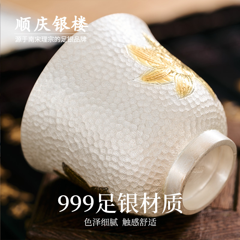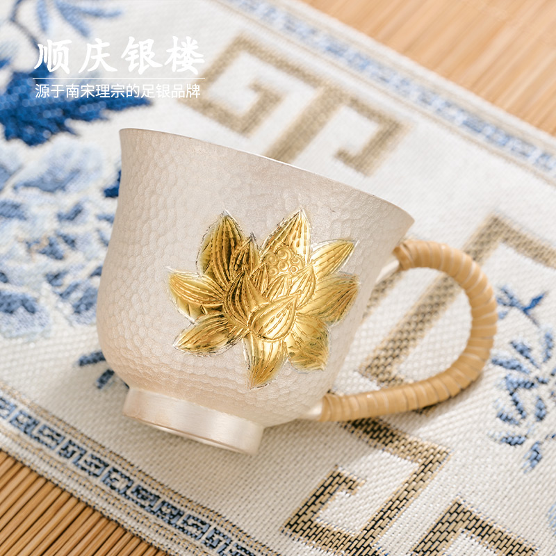 S999纯银鎏金茶杯荷花盛开足银杯子手工功夫茶具餐具品茗送礼物