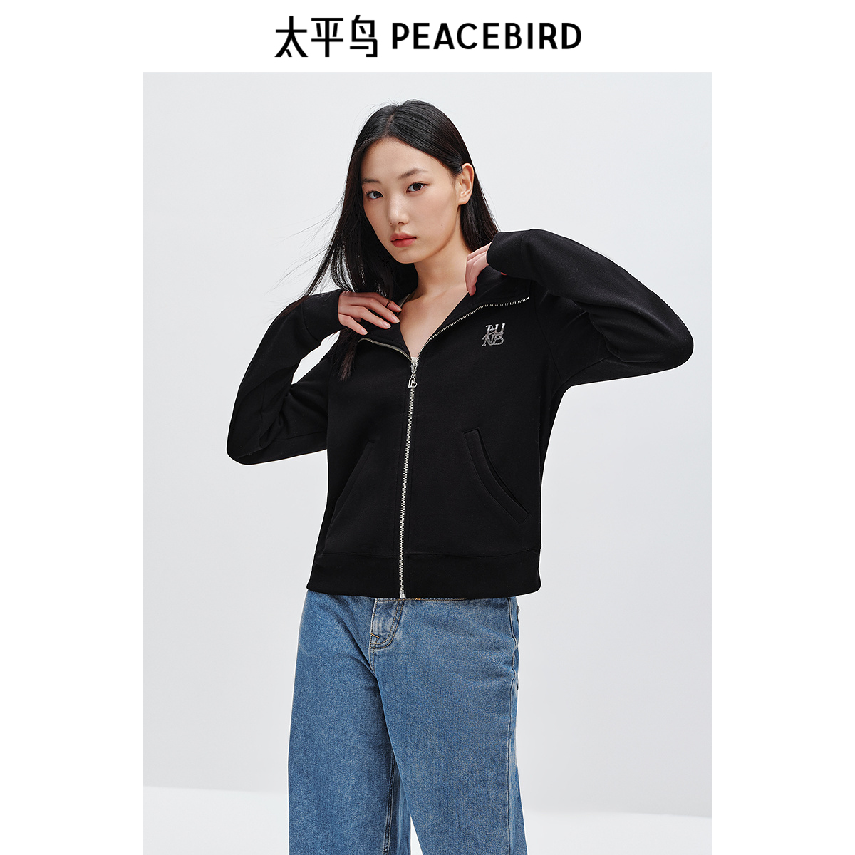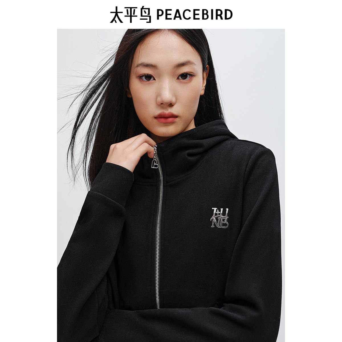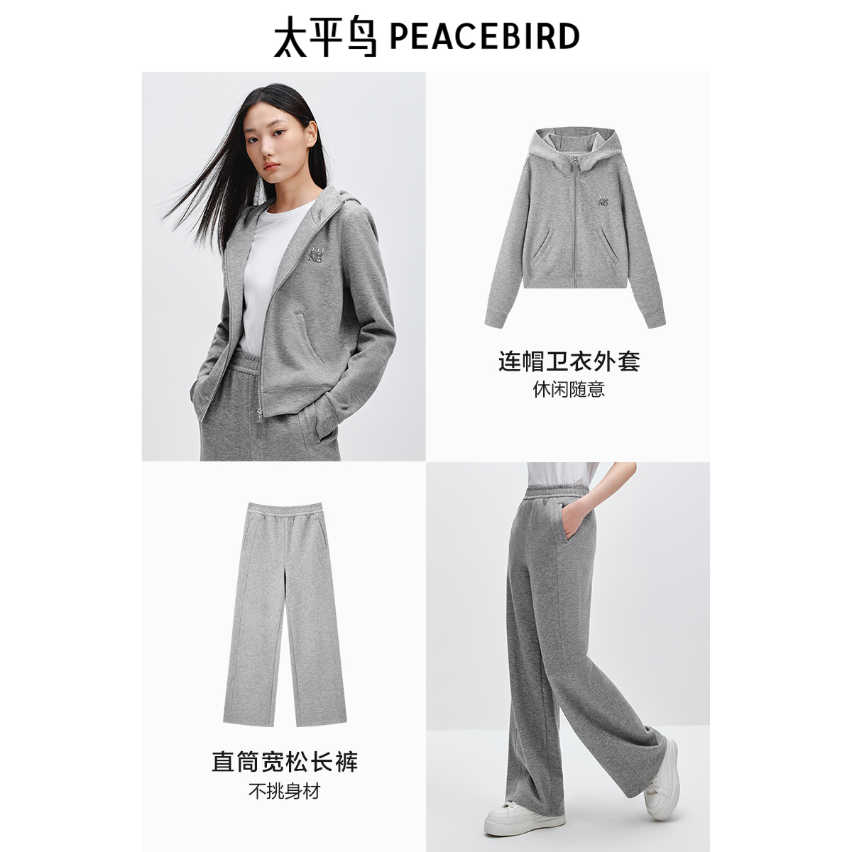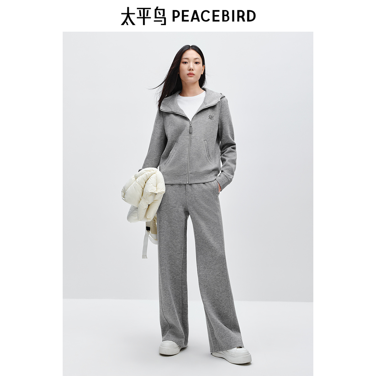 太平鸟 25冬季新款拉链式字母薄绒连帽卫衣外套宽松直筒长裤套装