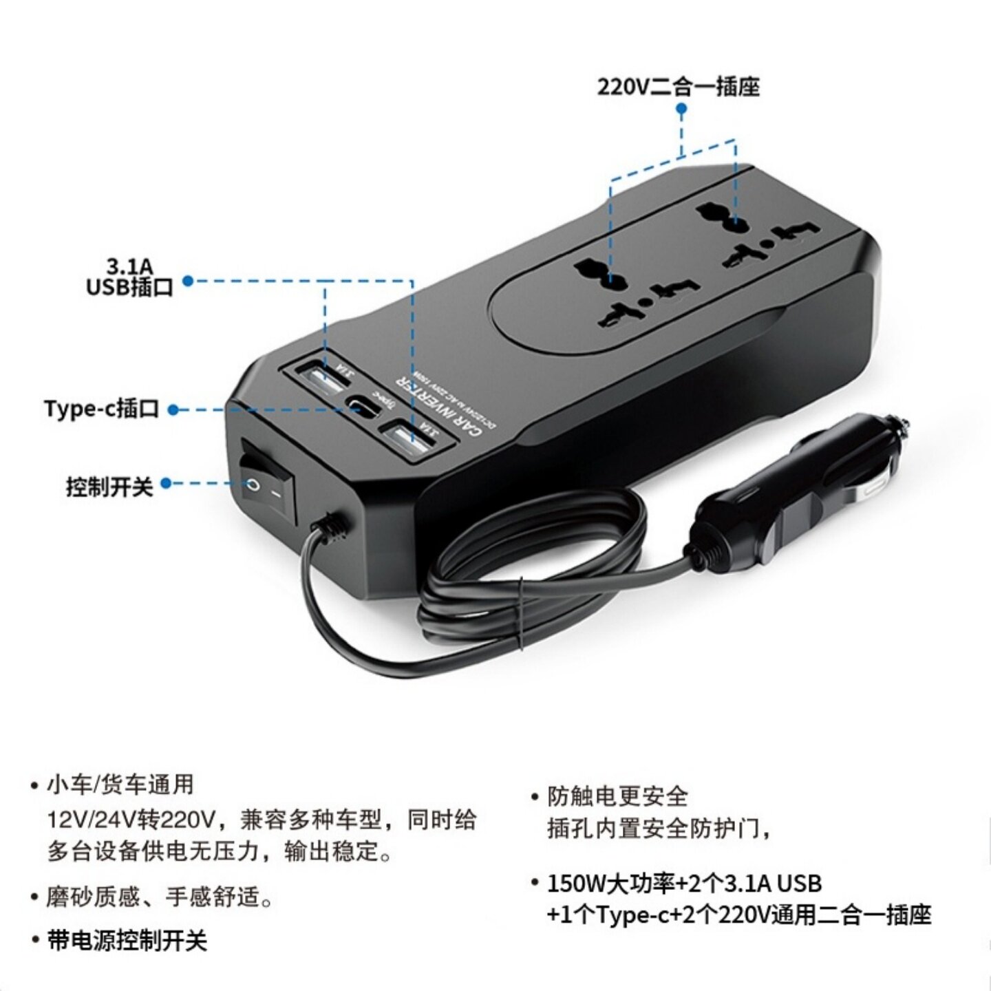 150W快充多功能汽车点烟器车充转220V家用充电器排插车载逆变器