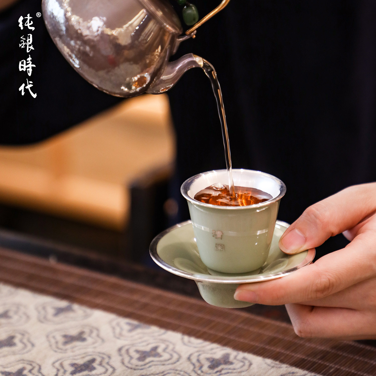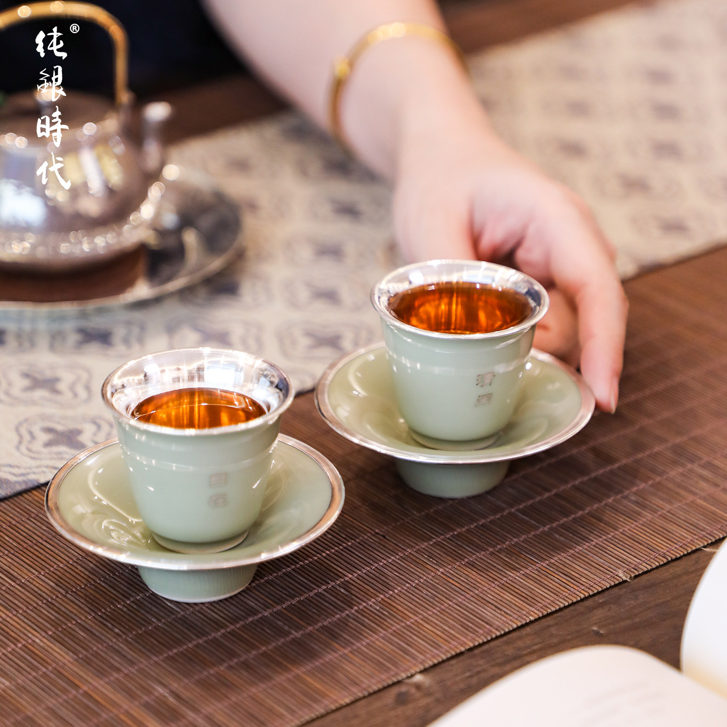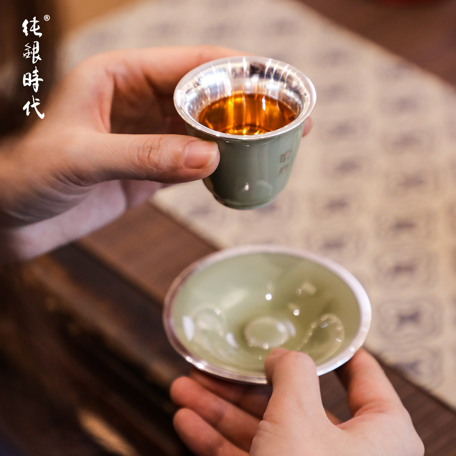 纯银时代 半知瓷包银杯礼盒品茗杯足银999茶盏手工主人杯单杯50ml