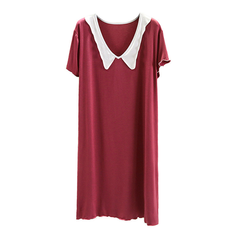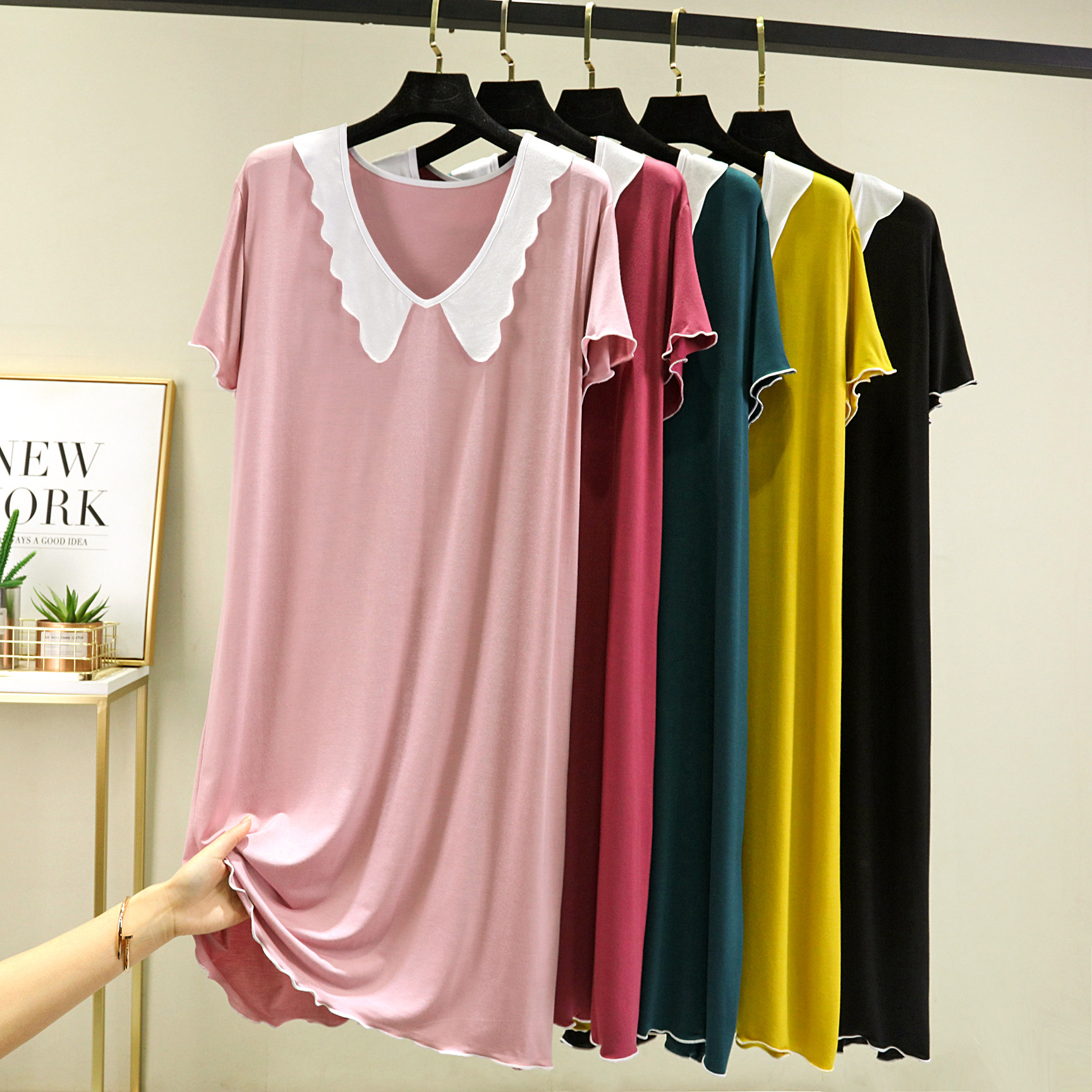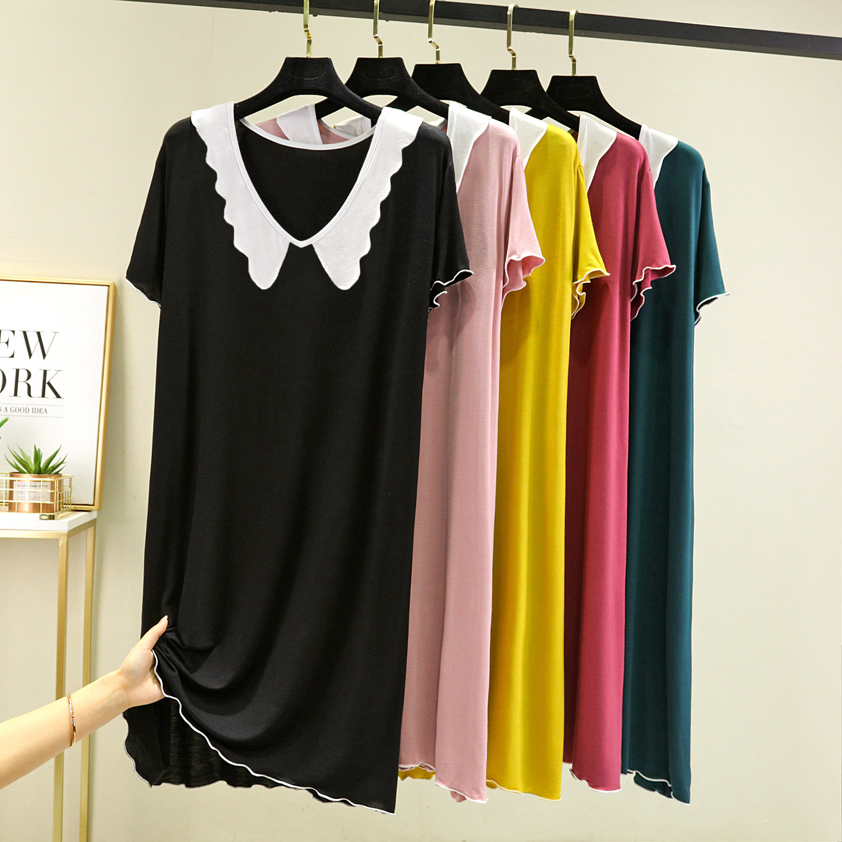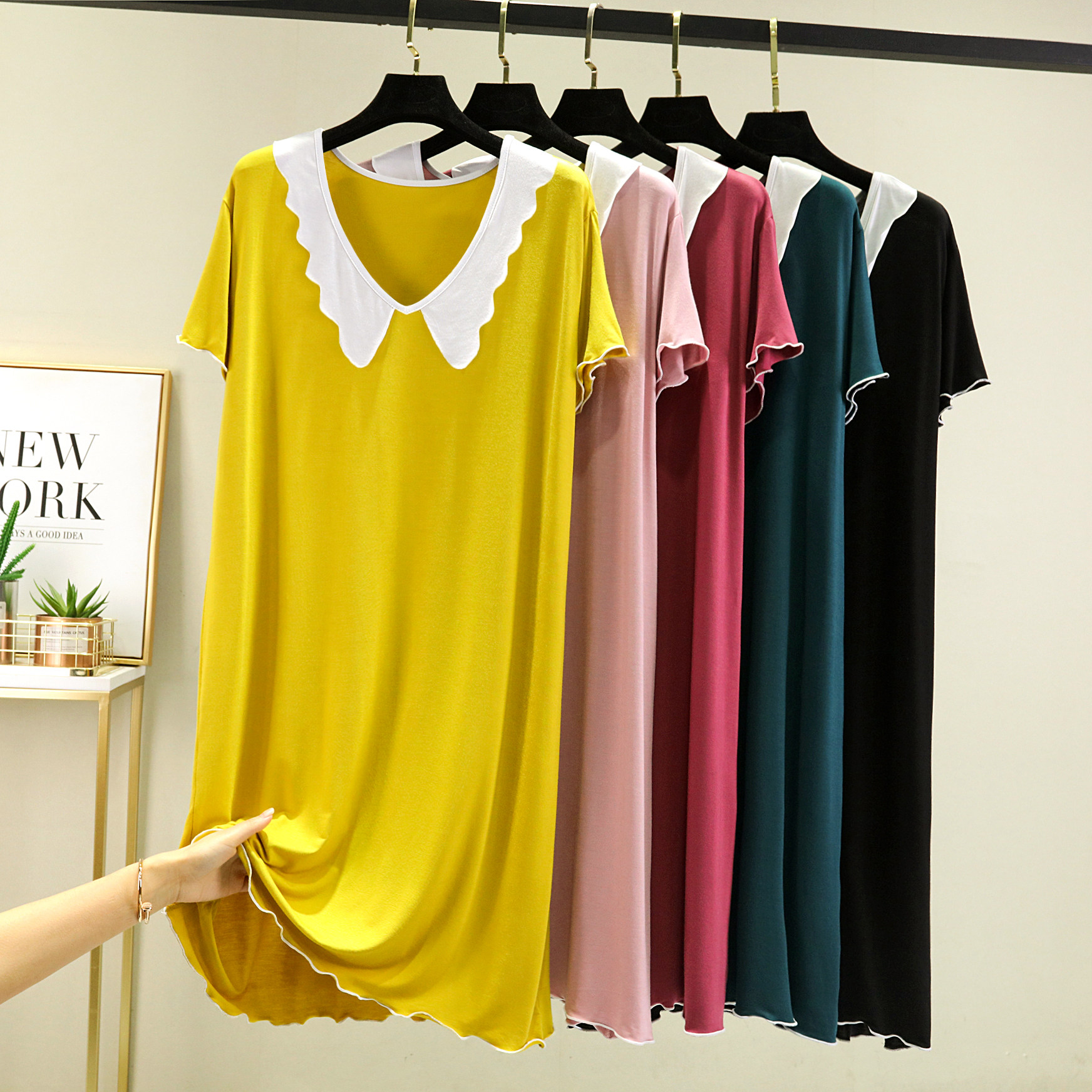 莫代尔V领短袖连衣裙女夏季休闲薄款居家睡裙宽松大码过膝A字长裙