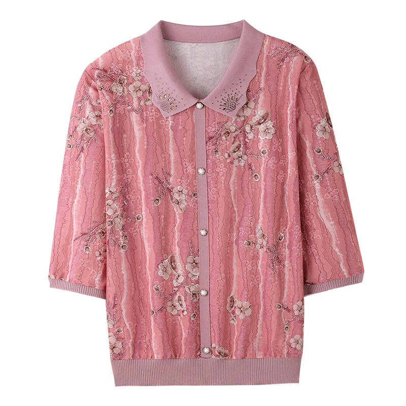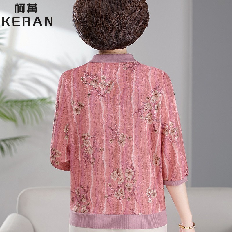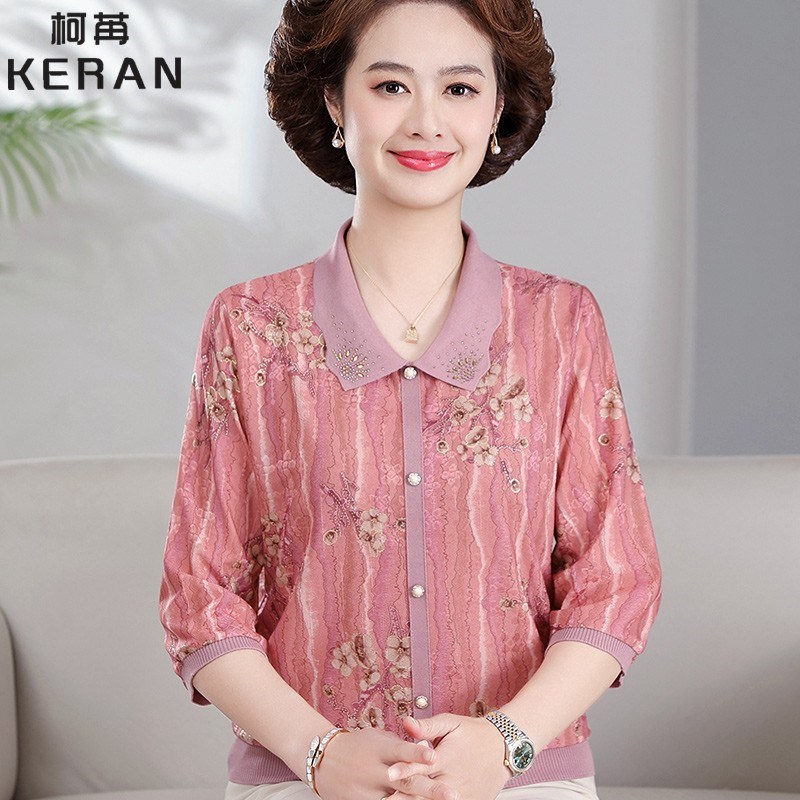 妈妈春夏装新款七分袖翻领薄款小衫中老年女宽松大码T恤衫套装