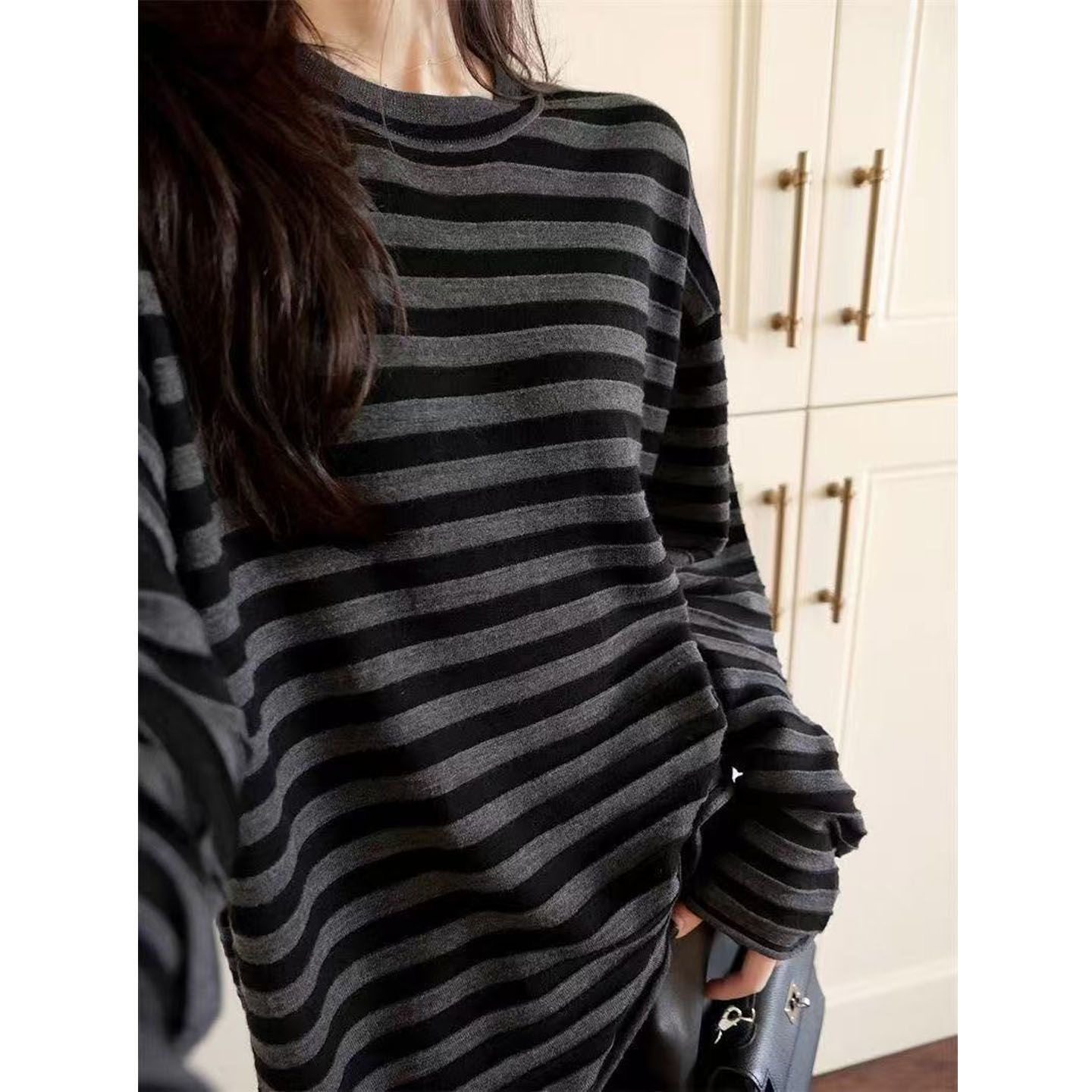 复古软糯德绒黑灰撞色条纹长袖T恤女秋冬磨毛松弛感百搭显瘦上衣