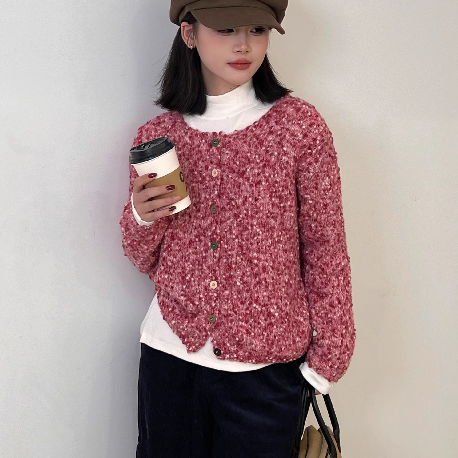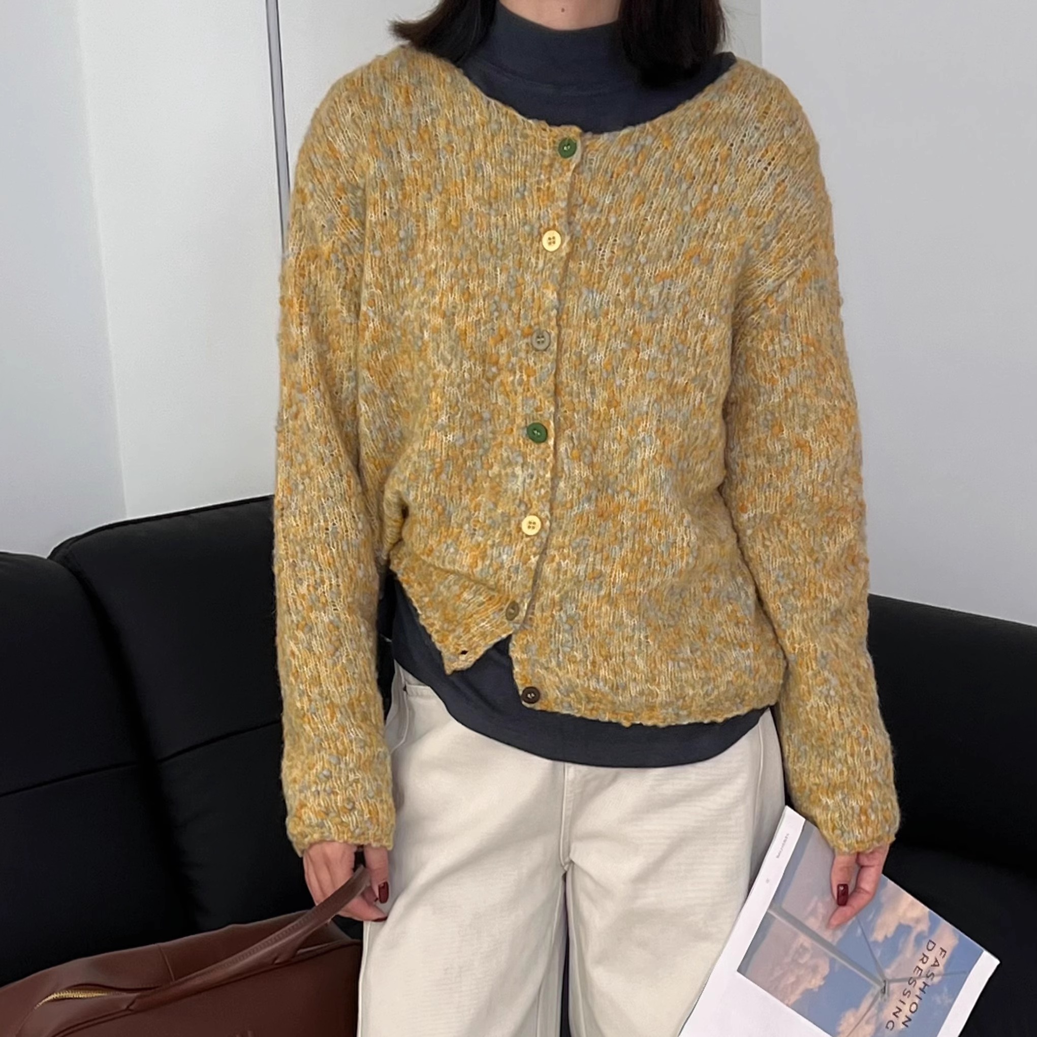 单排多扣圆领开衫毛衣