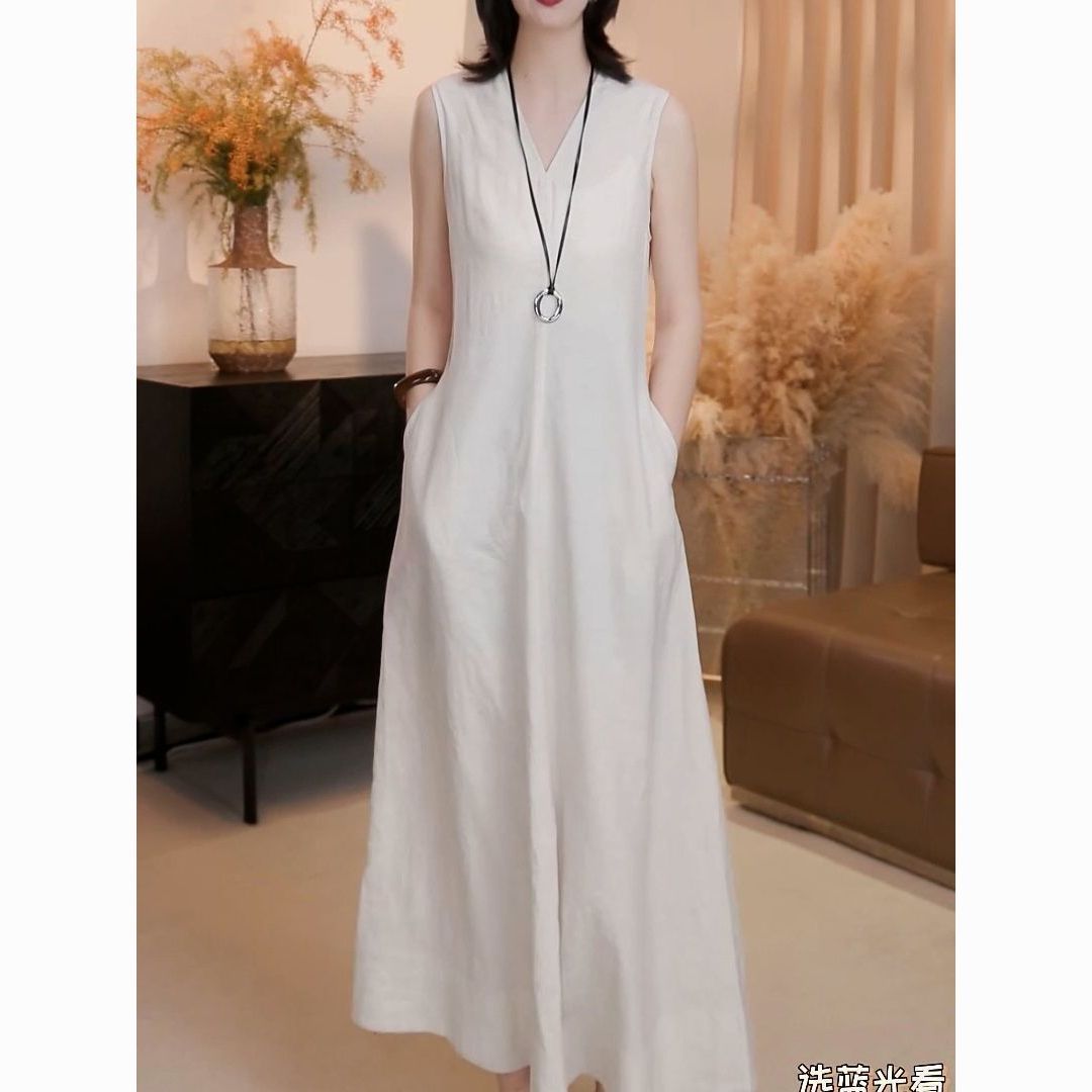 2025春夏季新款V领妈妈无袖文艺法式简约通勤时尚百搭连衣裙女装