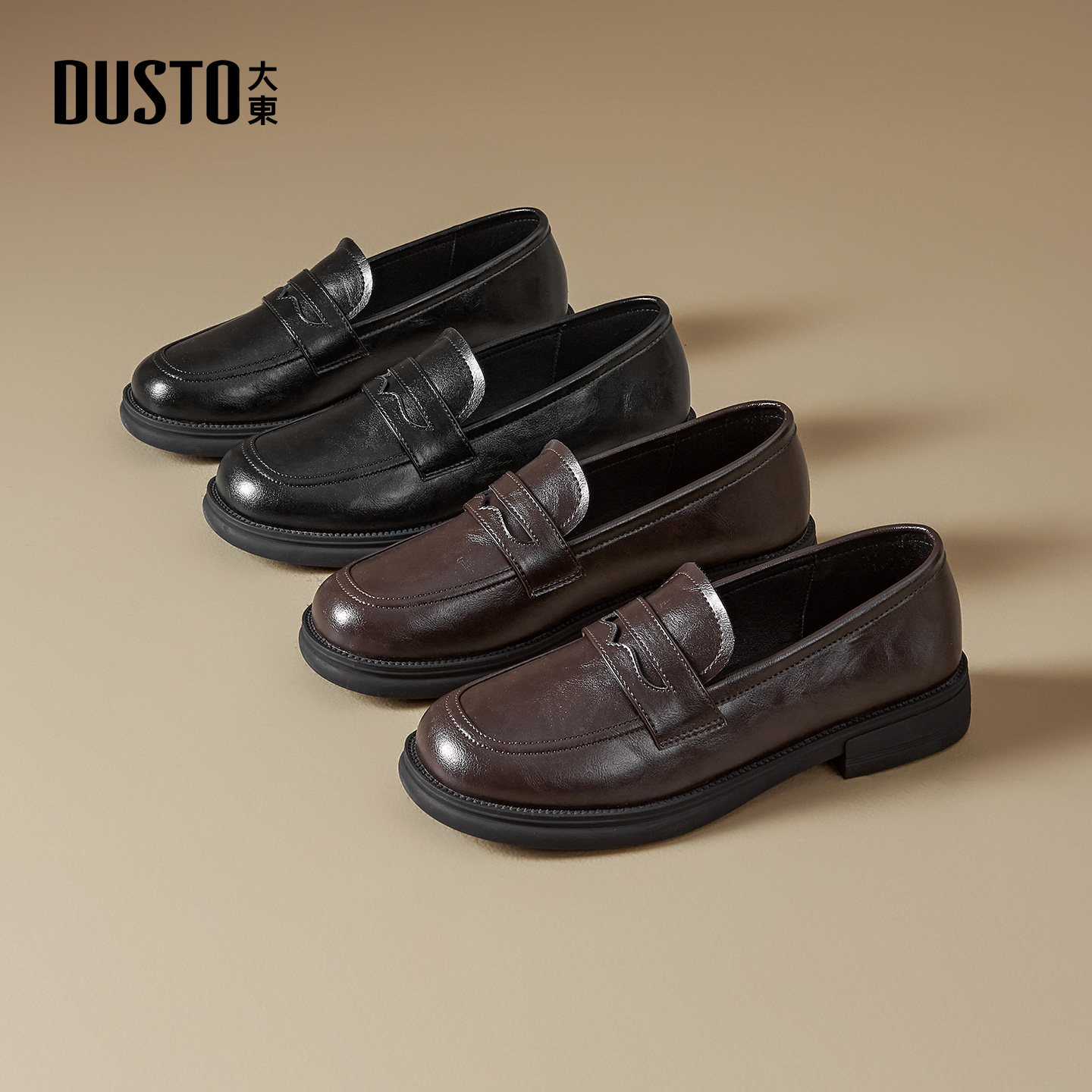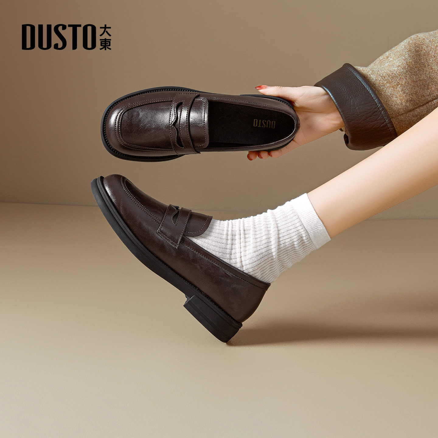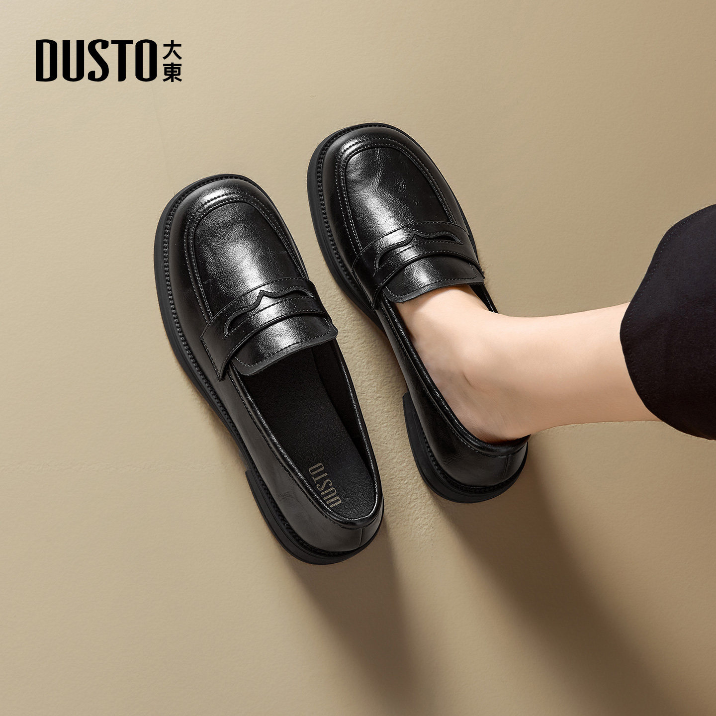 大东乐福鞋女鞋2026新款春季英伦风小皮鞋简约圆头方跟黑色通勤鞋