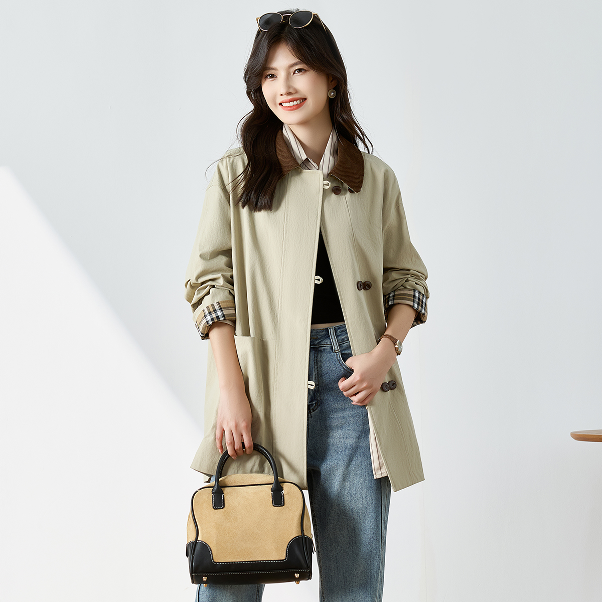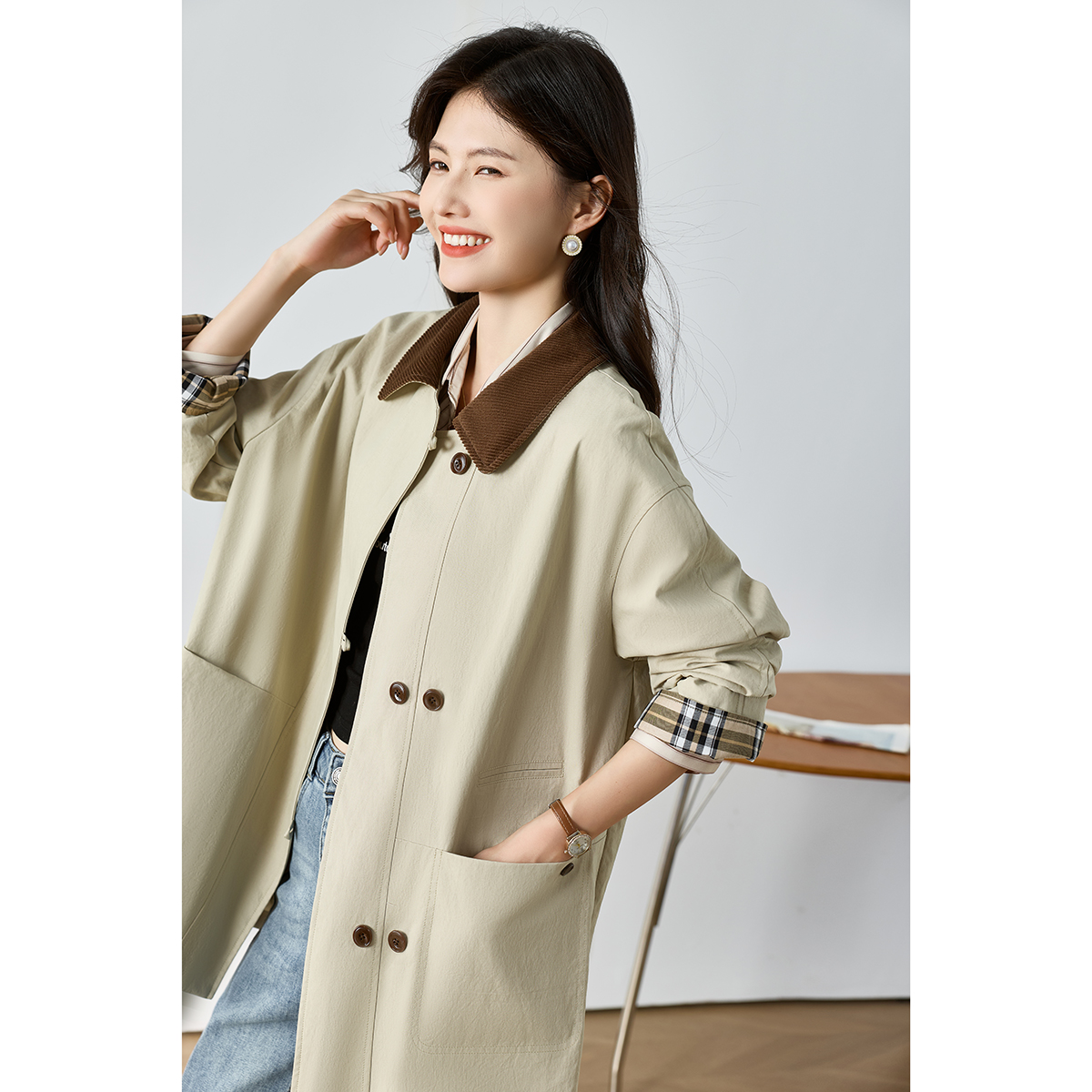 巴恩风撞色翻领风衣3S女装2025秋休闲显瘦百搭双排扣中长外套女