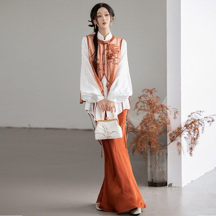 拟梦梦鲤国风原创新中式刺绣中国风马甲立领衬衫橘红斜裁鱼尾裙秋