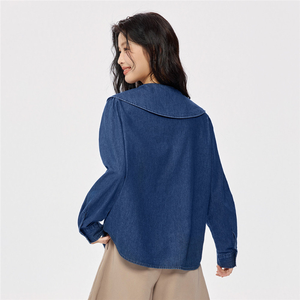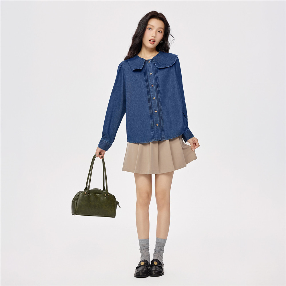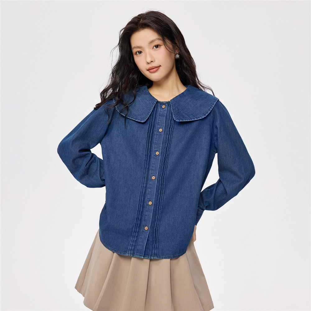 佐丹奴2026年春季新款洗水纯棉娃娃领宽松长袖牛仔衬衫女13345864