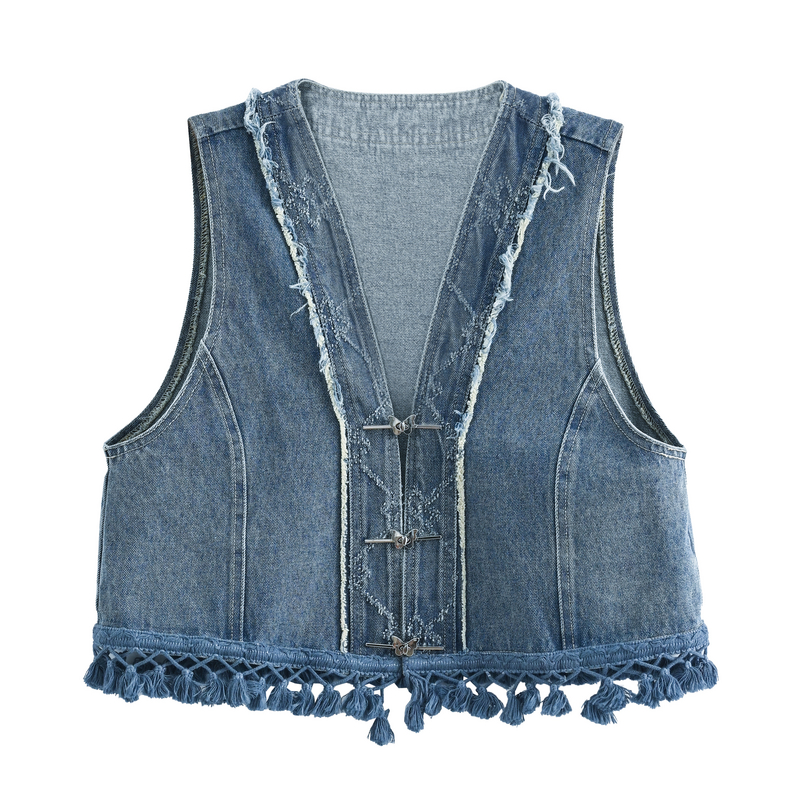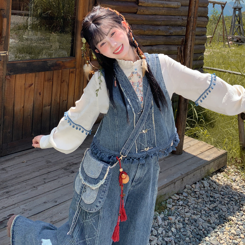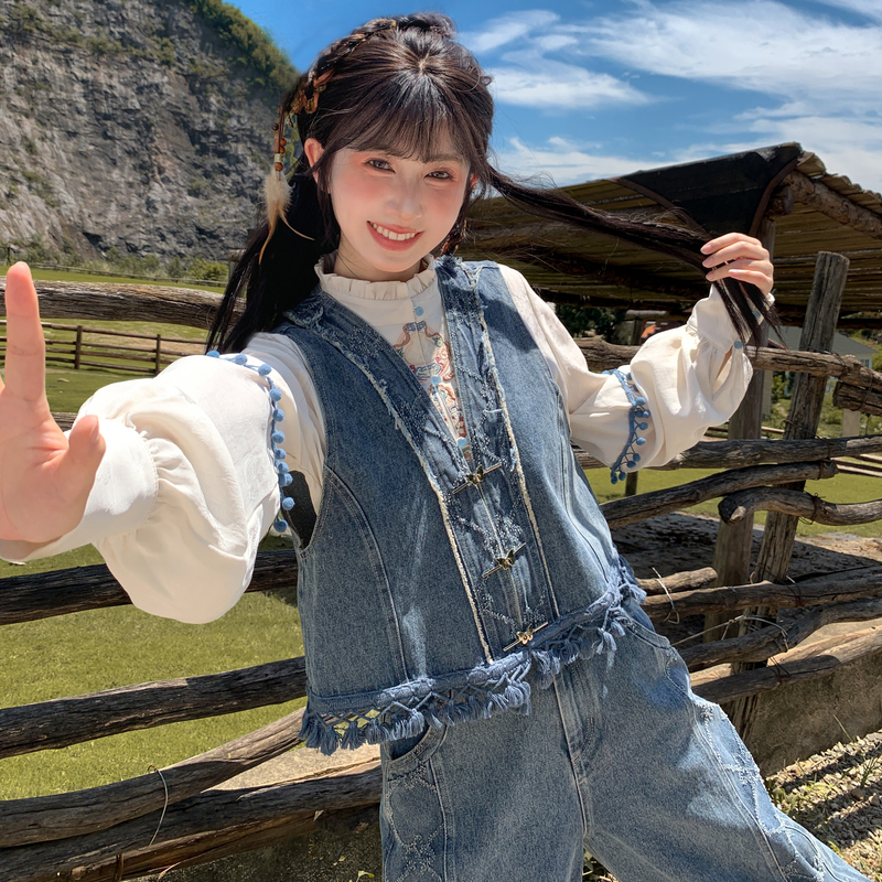 森女部落新中式套装女秋季度假风牛仔马甲2025新款设计感宽松上衣