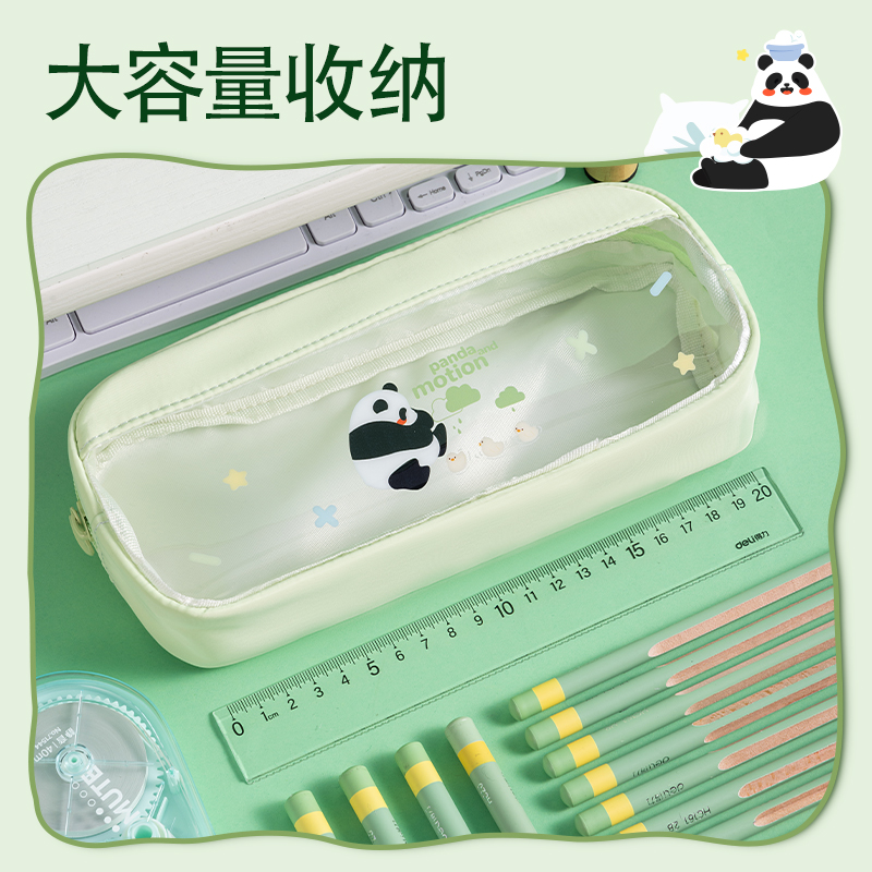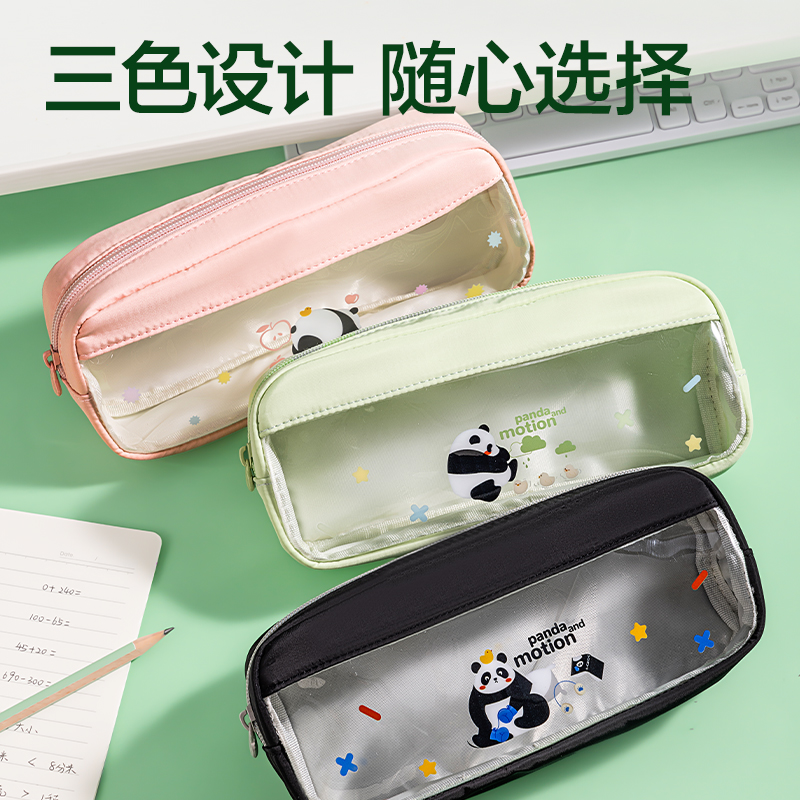 得力熊猫笔袋透视窗大容量文具盒小学生铅笔盒初中生文具袋女孩笔袋可爱一年级二三年级男生文具收纳化妆包