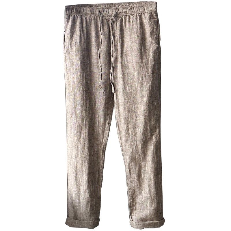 日系条纹亚麻休闲裤男士薄款小脚修身麻料青年直筒收腿棉麻长裤子