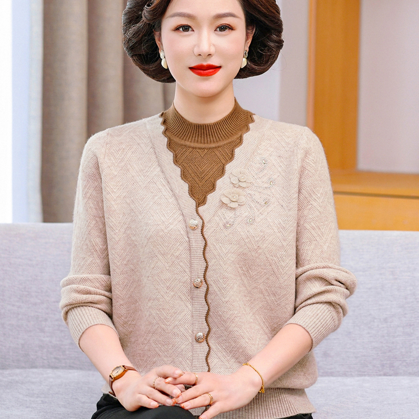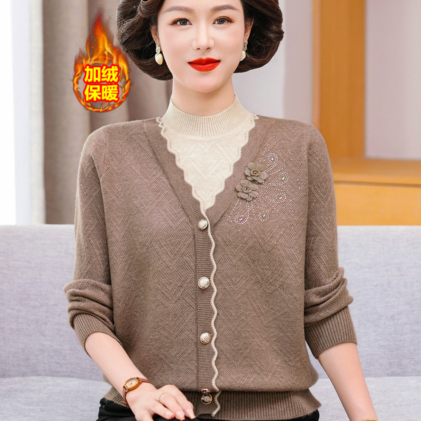 妈妈秋冬毛衣加厚洋气假两件中年女装上衣一体绒中老年加绒打底衫