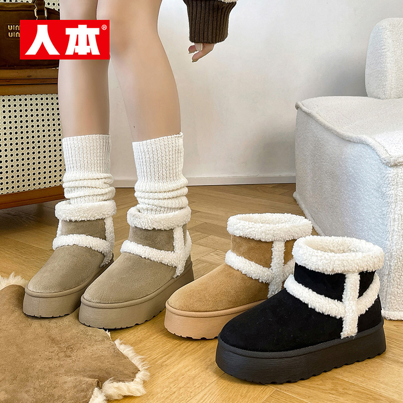 人本加绒保暖雪地靴女2025新款冬季皮毛一体超暖女鞋百搭小众短靴