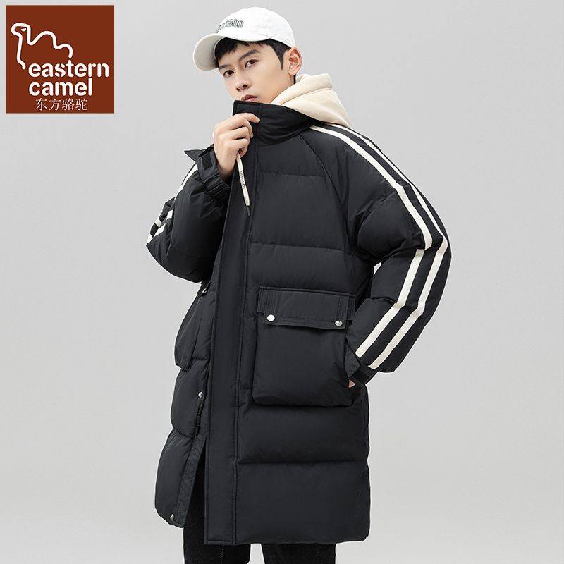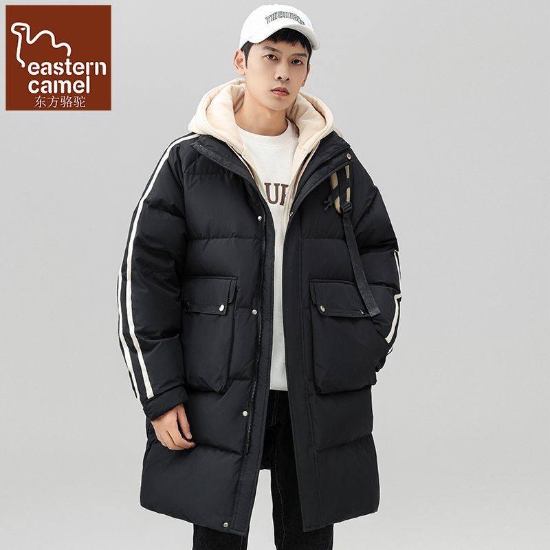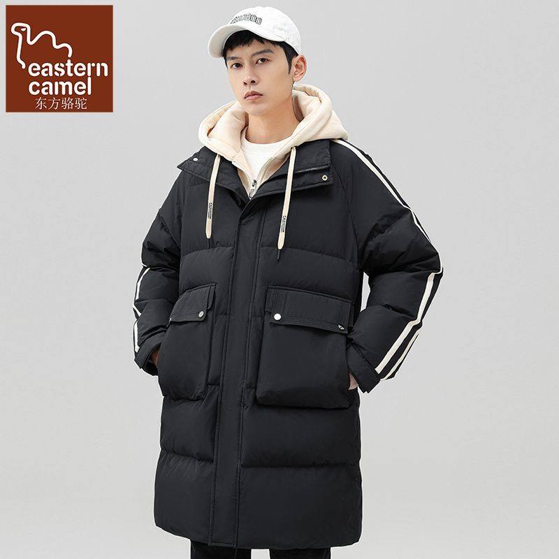 东方骆驼冬季连帽条纹保暖加厚防风大口袋中长款假两件羽绒服男潮