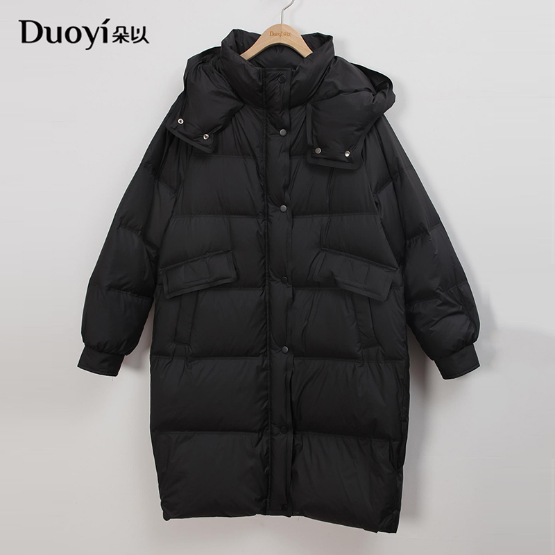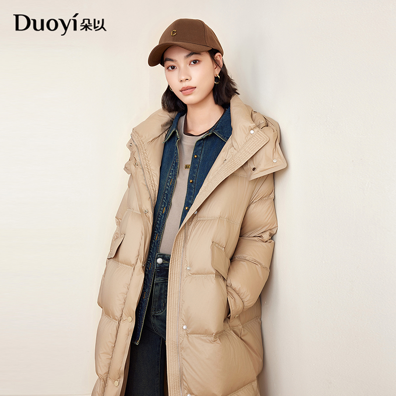 朵以2025秋冬新品通勤时髦连帽保暖口袋羽绒服宽松显瘦中长款外套