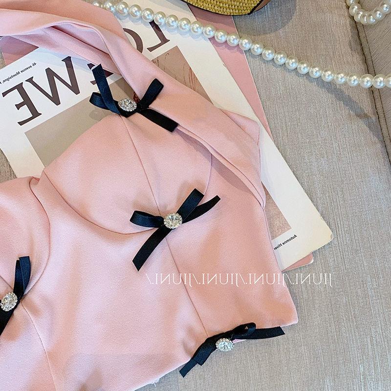 蝴蝶结甜辣性感挂脖短上衣女高级感法式2023新款粉色夏装气质名媛