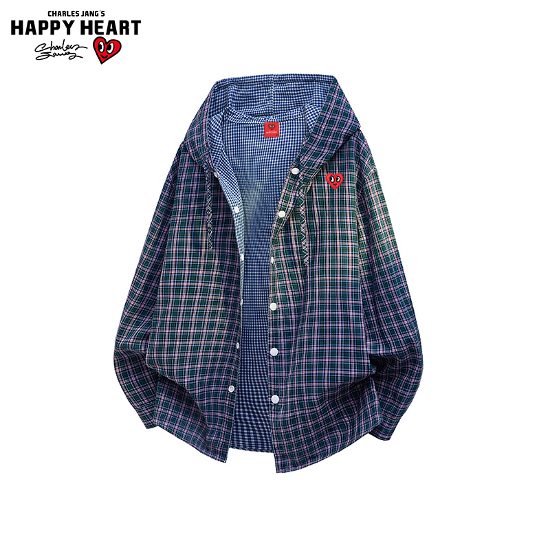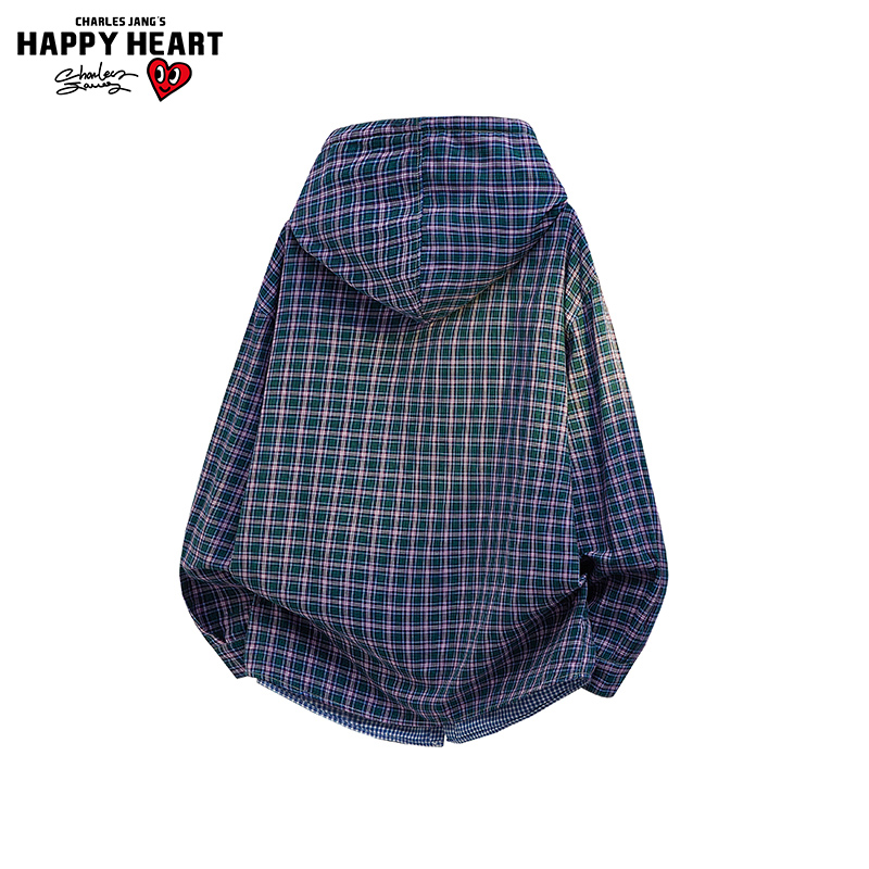 查尔斯桃心 美式复古连帽格子夹克男女春秋季宽松新款潮流外套