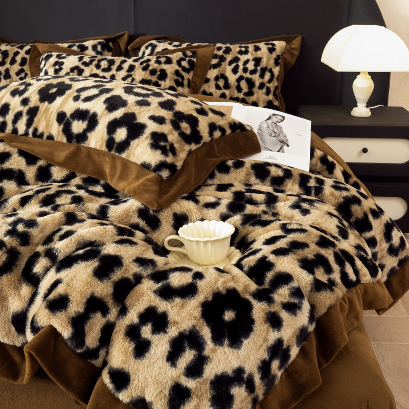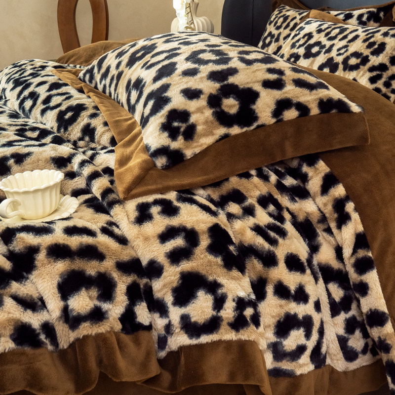 A类豹纹兔绒保暖牛奶绒三四件套冬季加厚珊瑚绒床单毛绒被套床笠4
