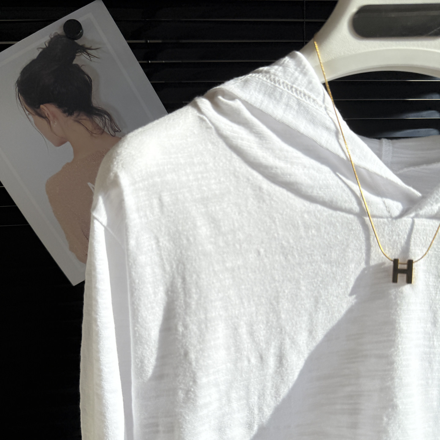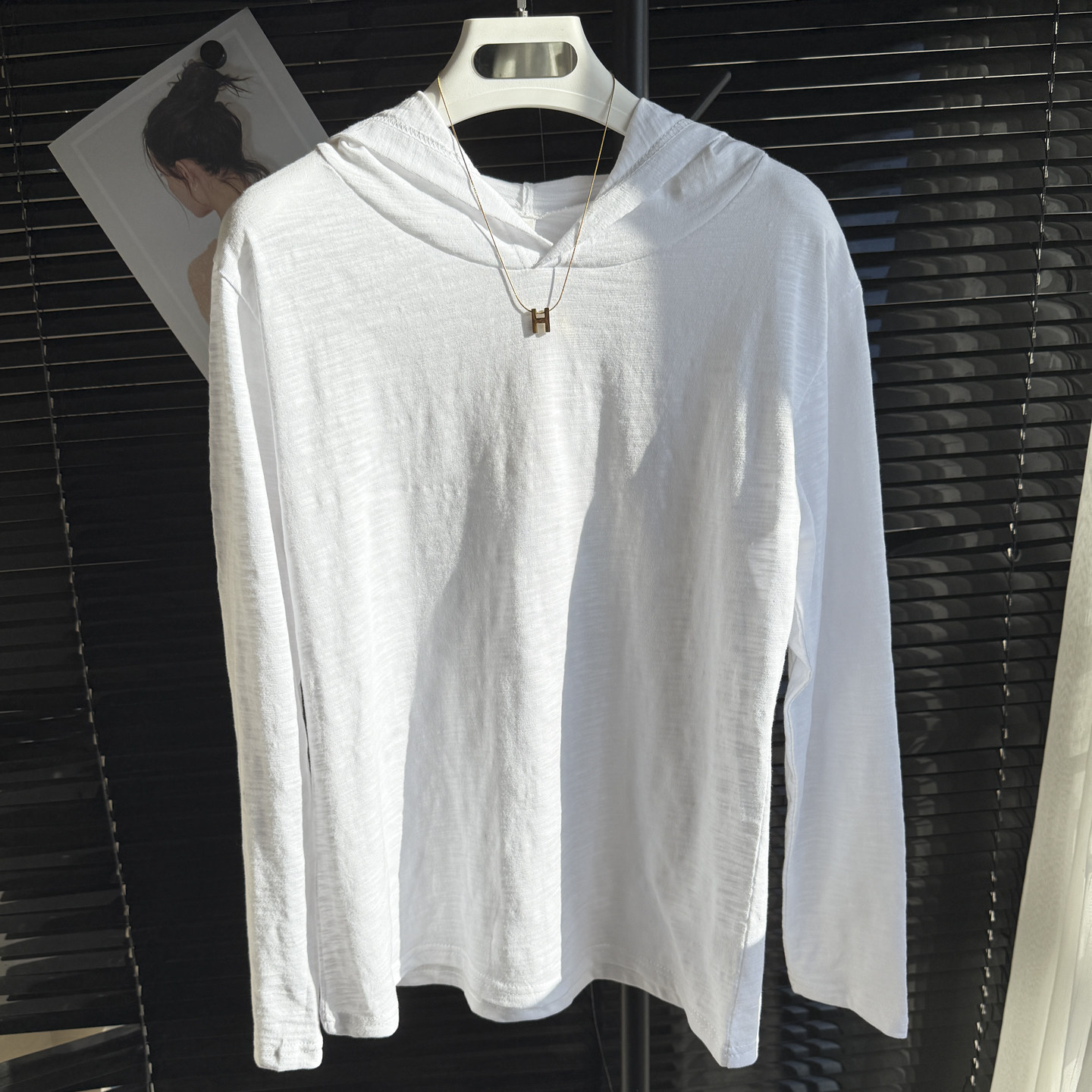 白色连帽长袖t恤女休闲2025春秋竹节棉质百搭卫衣宽松内搭打底衫