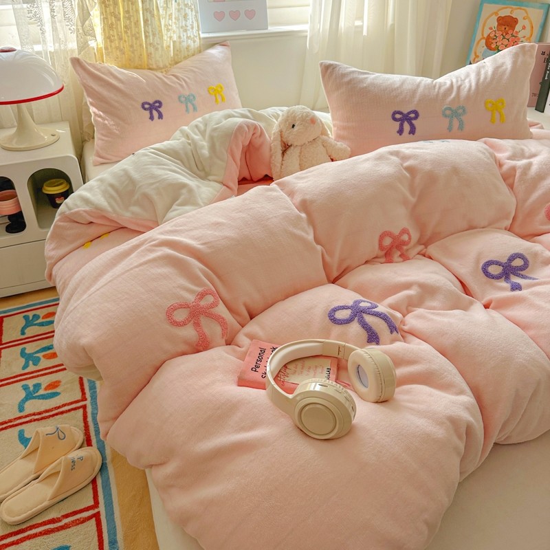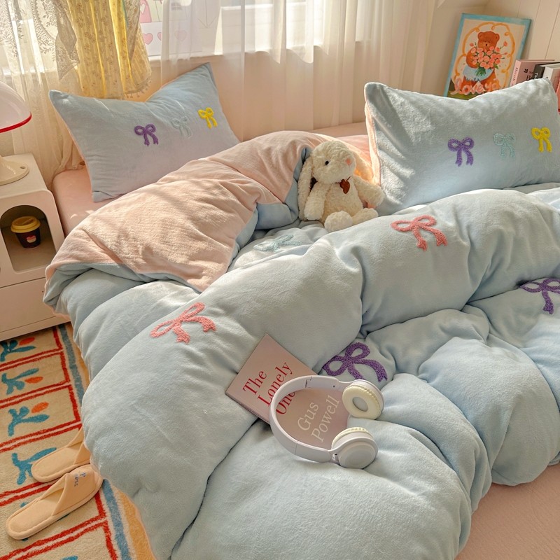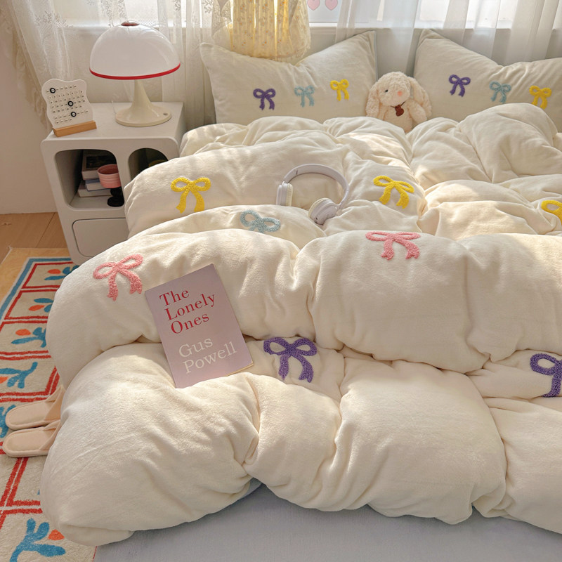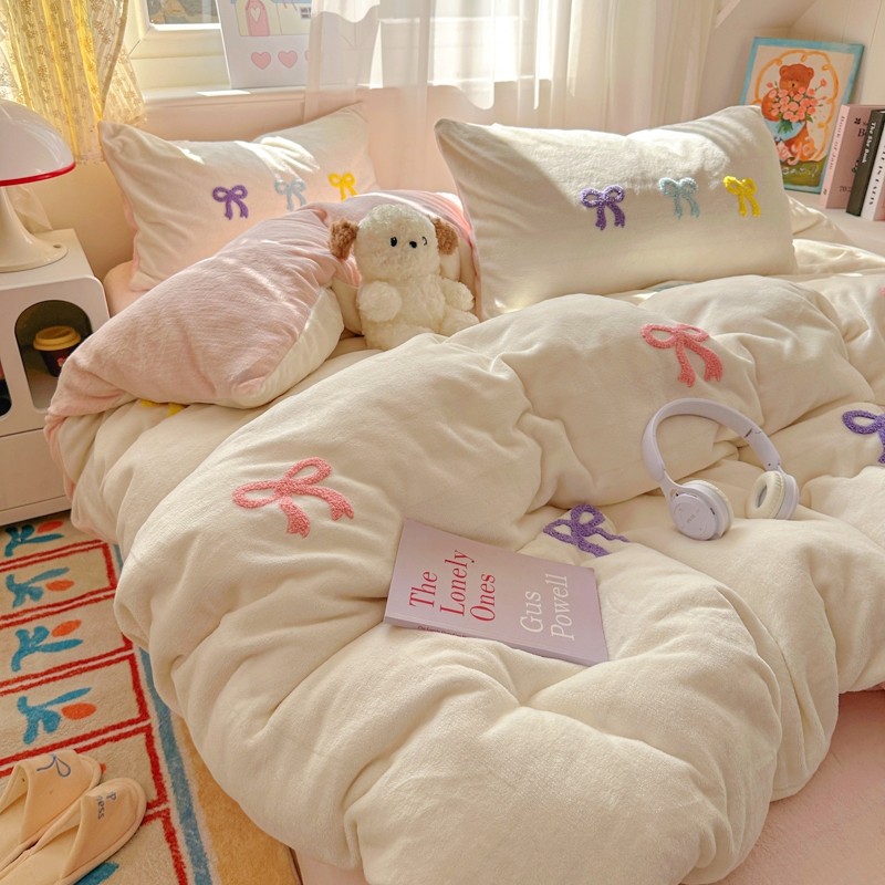 冬季牛奶绒床上毛绒四件套珊瑚绒蝴蝶结法兰绒被套床笠宿舍三件套