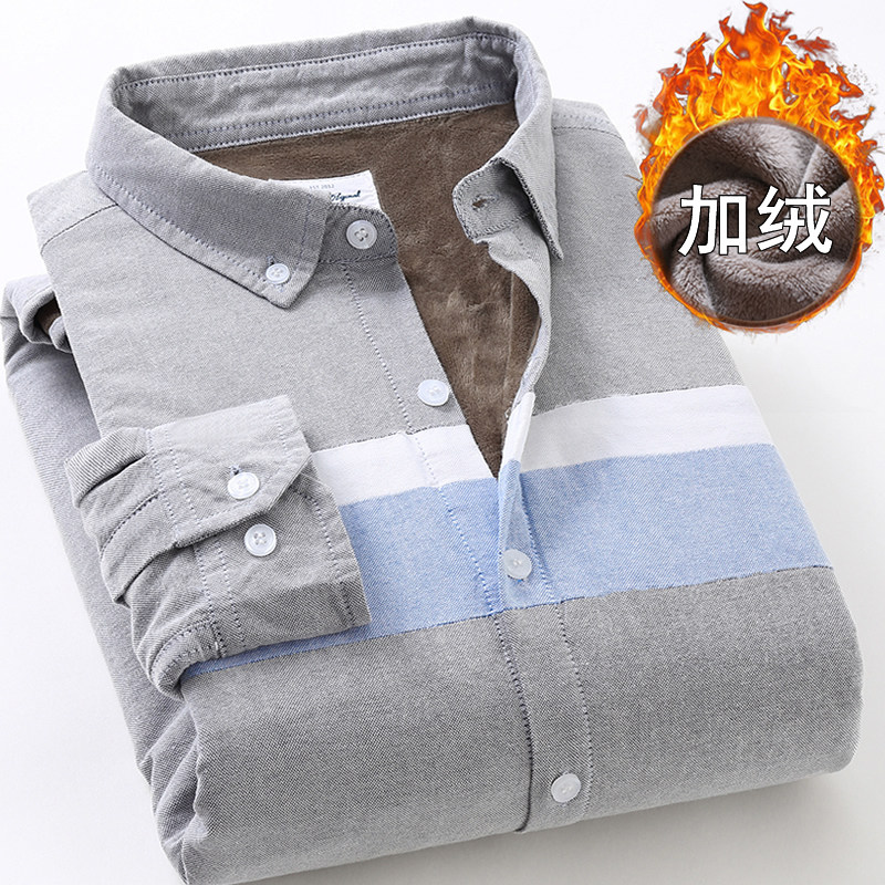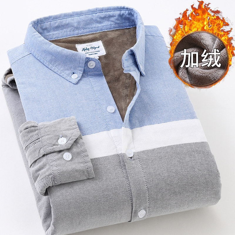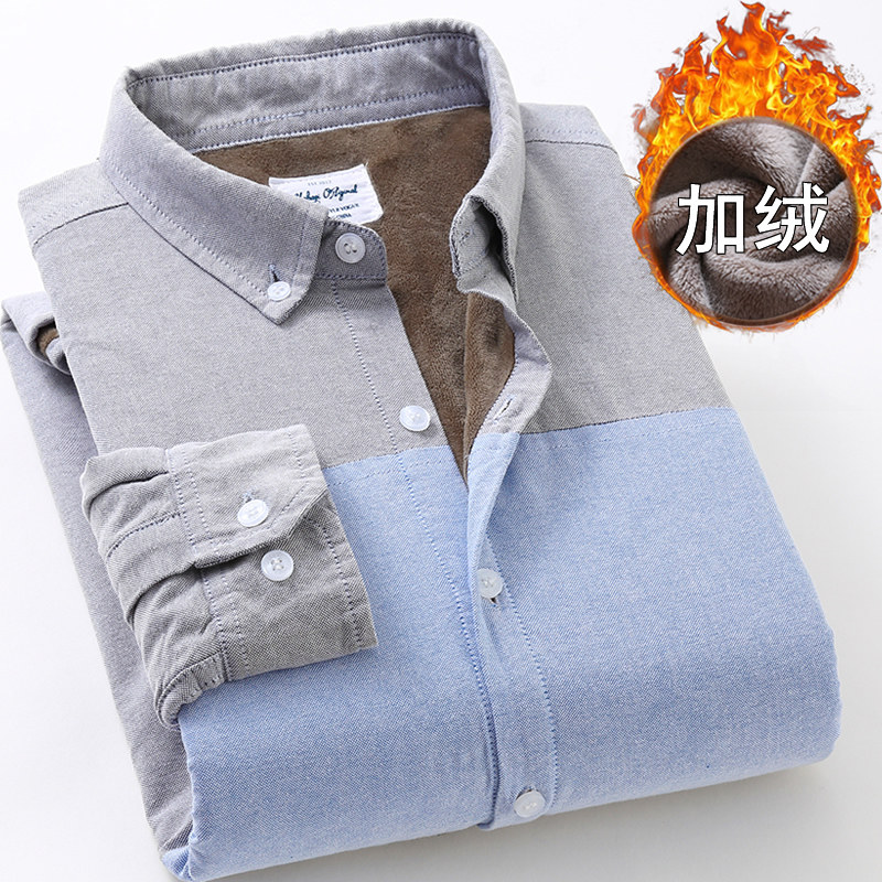 莎芭绮冬男装纯棉牛津纺拼接保暖衬衫男长袖加绒加厚大码保暖衬衣