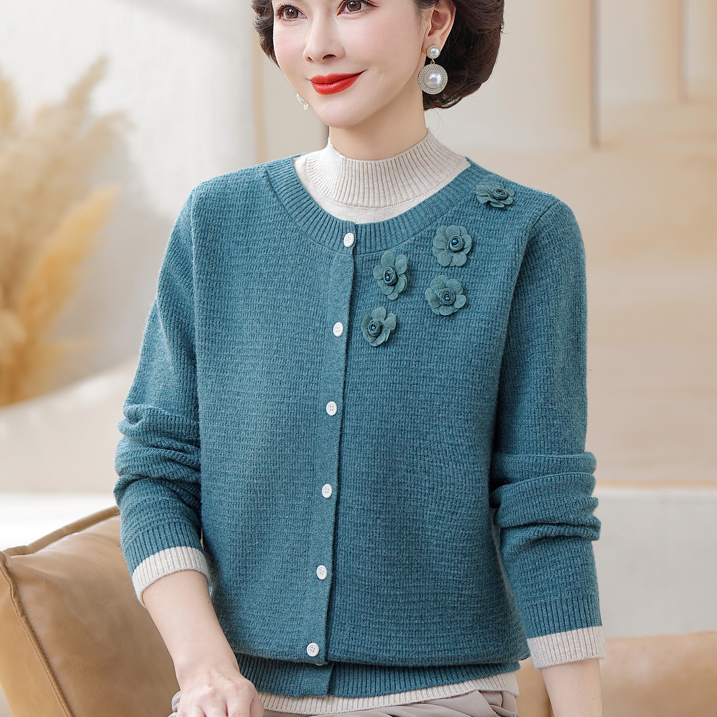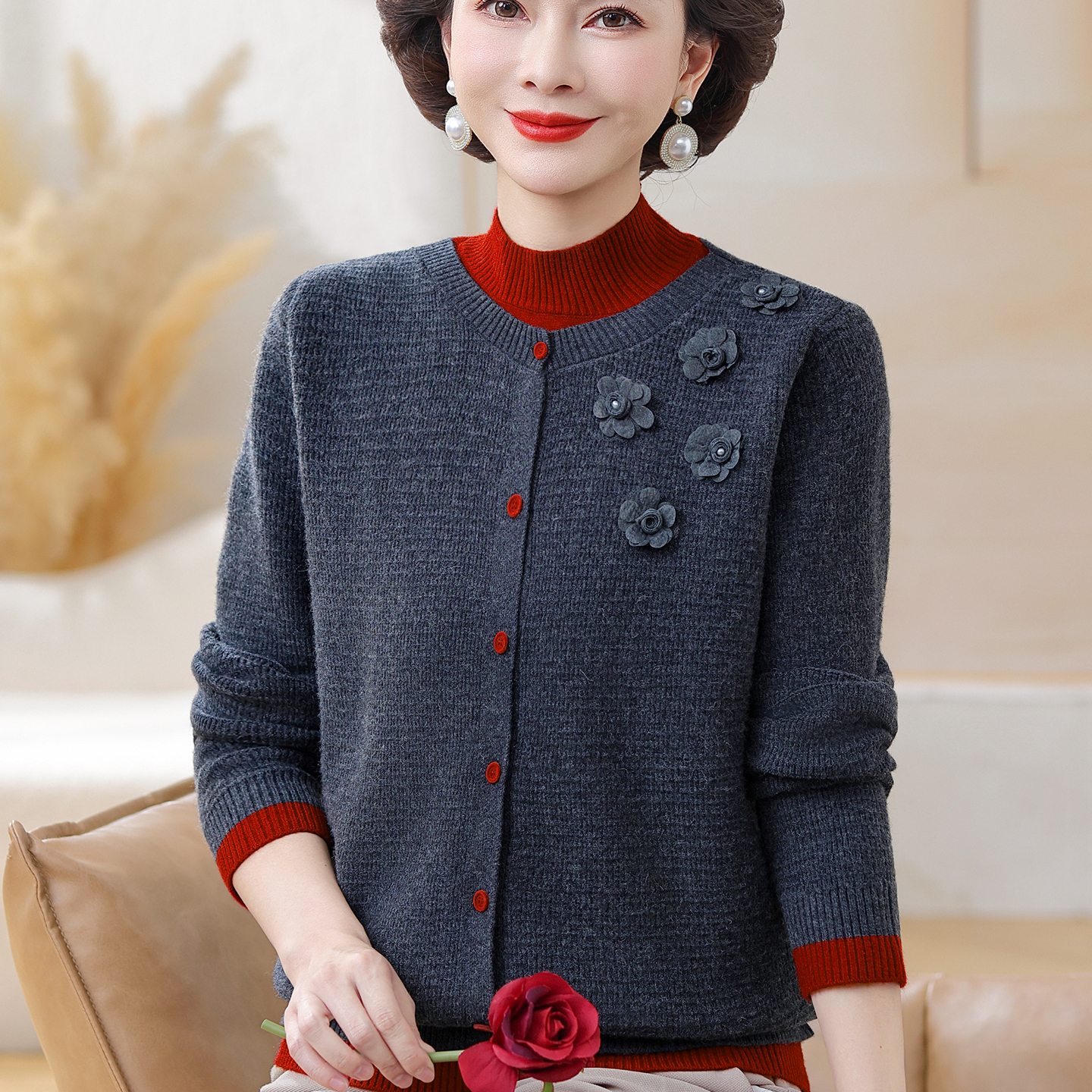 妈妈打底衫2025秋装新款中老年人女装假两件针织开衫时尚减龄毛衣