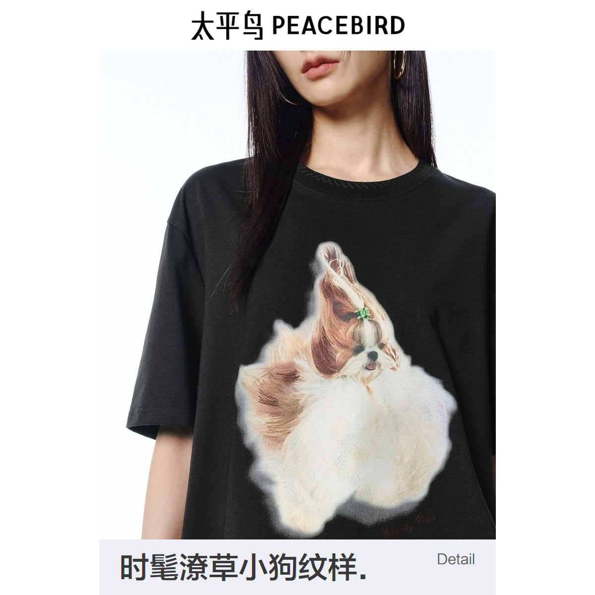 【3A抗菌】太平鸟女装遮热凉感潦草小狗图案短袖T恤25夏季上衣女