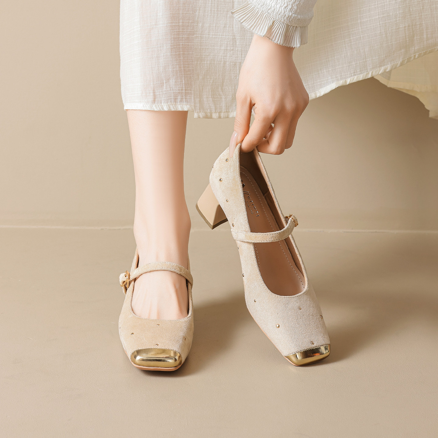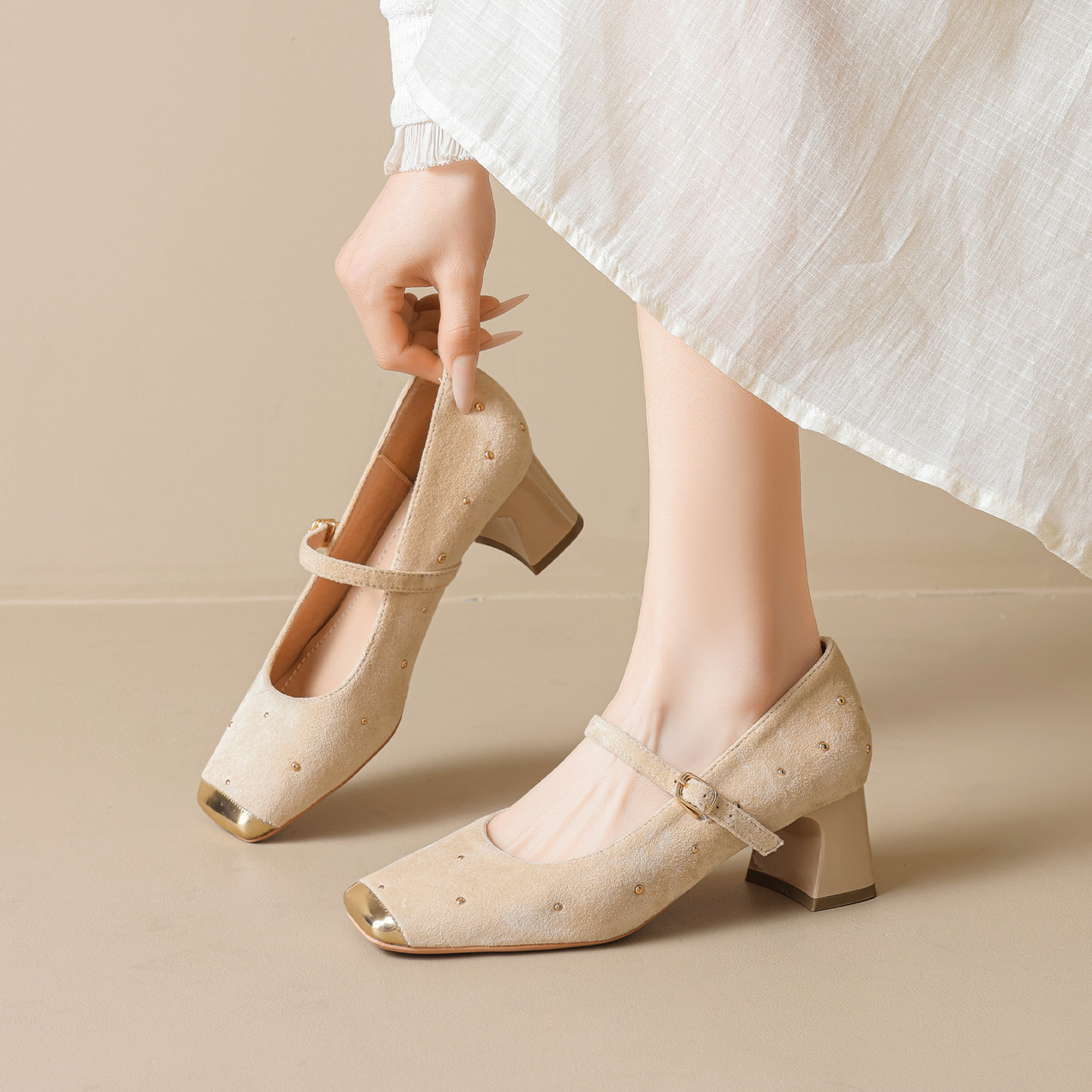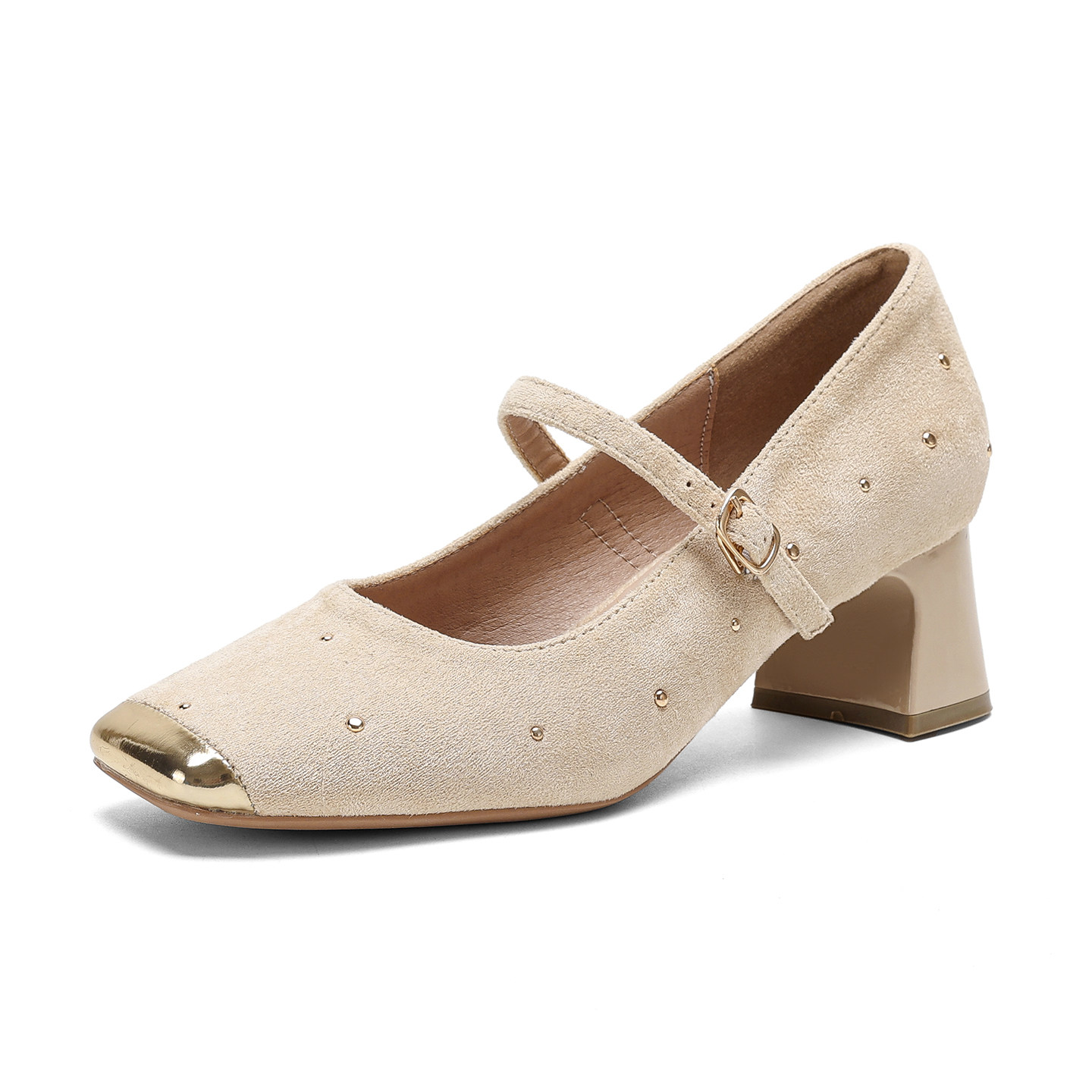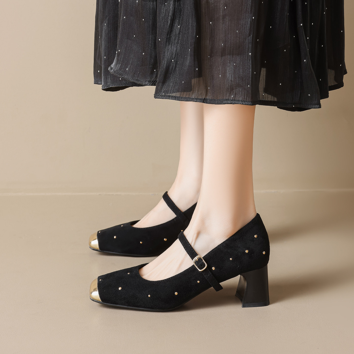 羊皮版~法式玛丽珍单鞋女2026新款铆钉粗跟不累脚高跟鞋大码女鞋