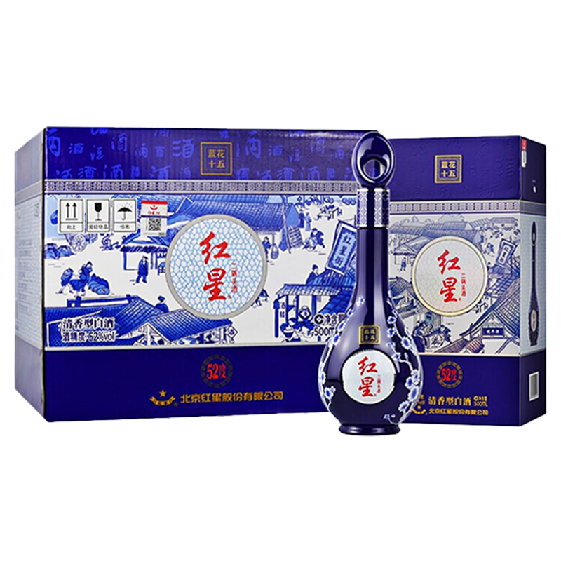 官方授权北京红星二锅头52度蓝花15蓝花瓷十五500ml*6整箱礼盒酒
