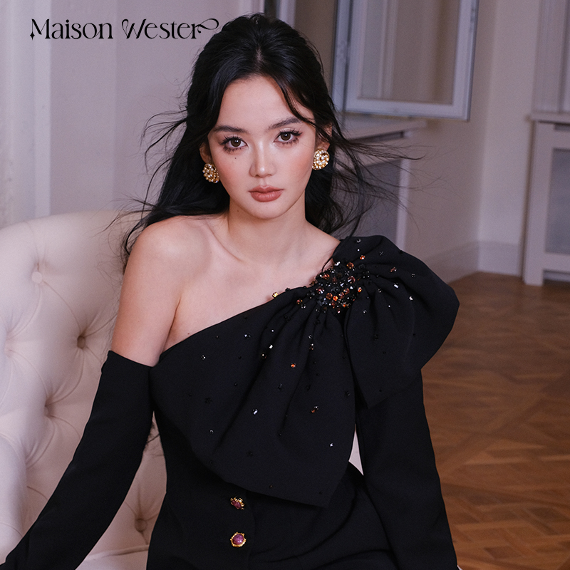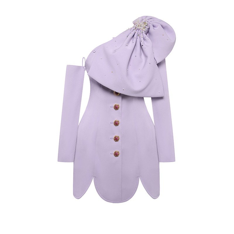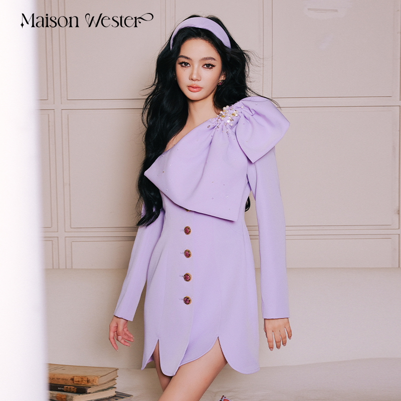 Maison Wester夏季女士流行气质紫色重工大蝴蝶结斜肩长袖连衣裙